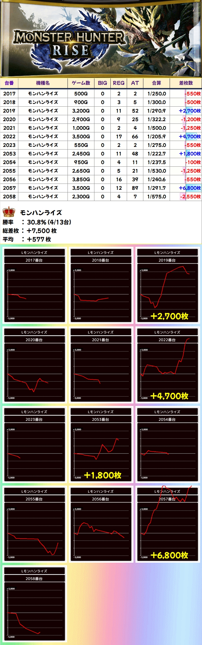 モンハンのみ稼働不足による不発台も見られますが、ノーマル機やいざ番は優秀成績でした!