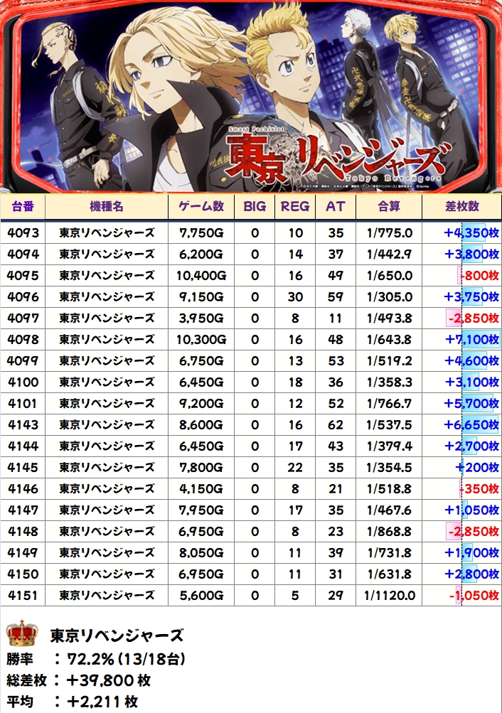 【1/2系濃厚】東リべ(13/18台+)→平均+2,211枚