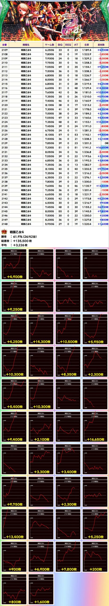 戦国乙女4(26/42台+)➡平均+3,226枚