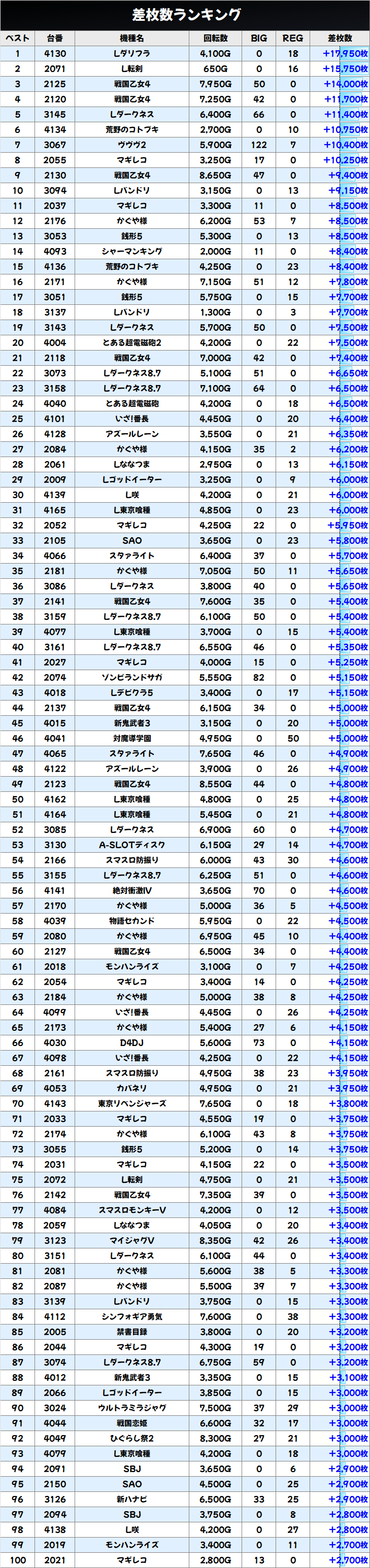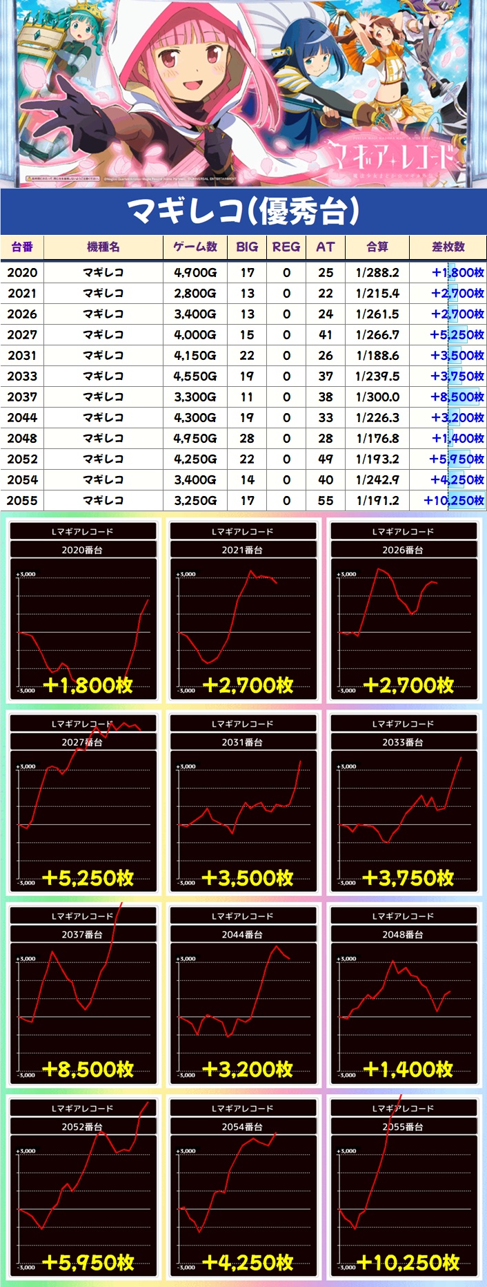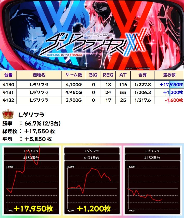 キャラ誕関連の咲や声優誕関連のダリフラも優秀で、ダリフラはコンプクラスの台も!キャラ誕&声優誕機種は毎回かなり優秀成績を残すので、誕生日と関連機種は毎日要チェック!