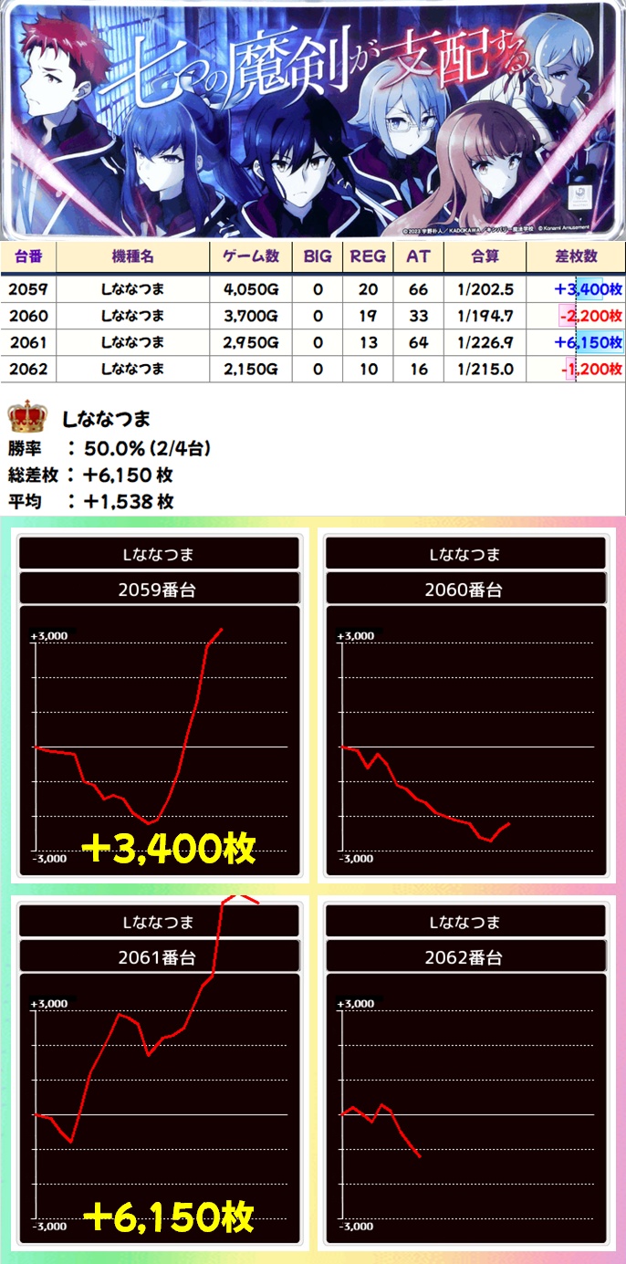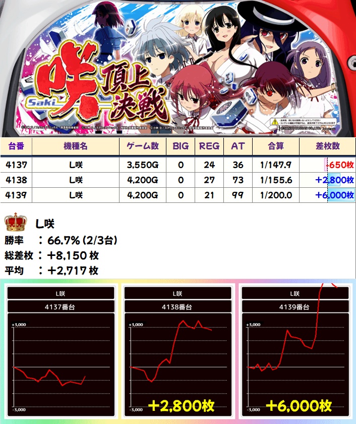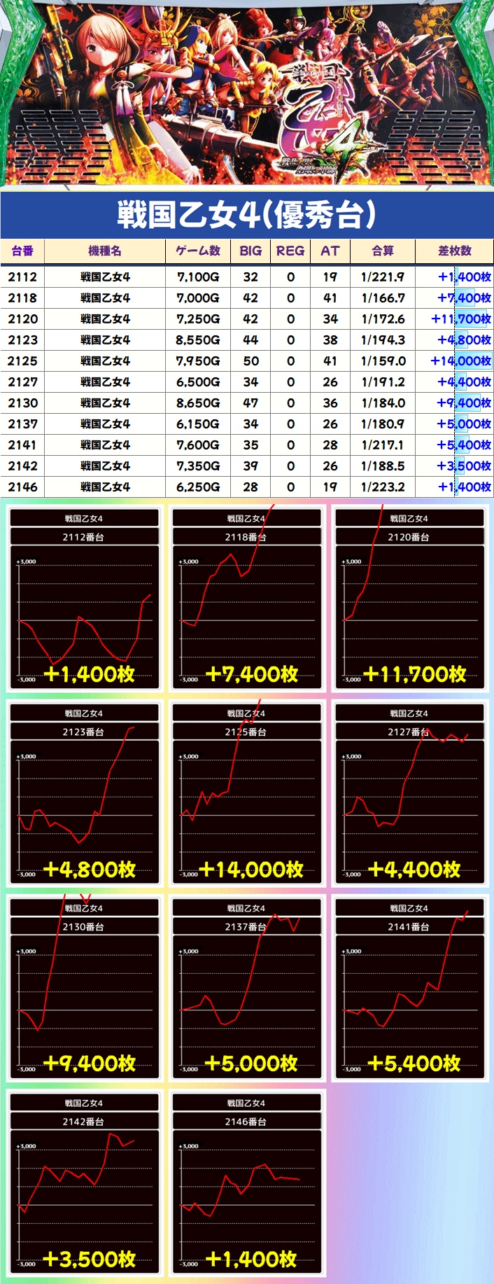 この日は上記2機種が頭一つ抜けて優秀!特に戦国乙女4は万枚超2台とかなり手厚かったのは間違いなし!