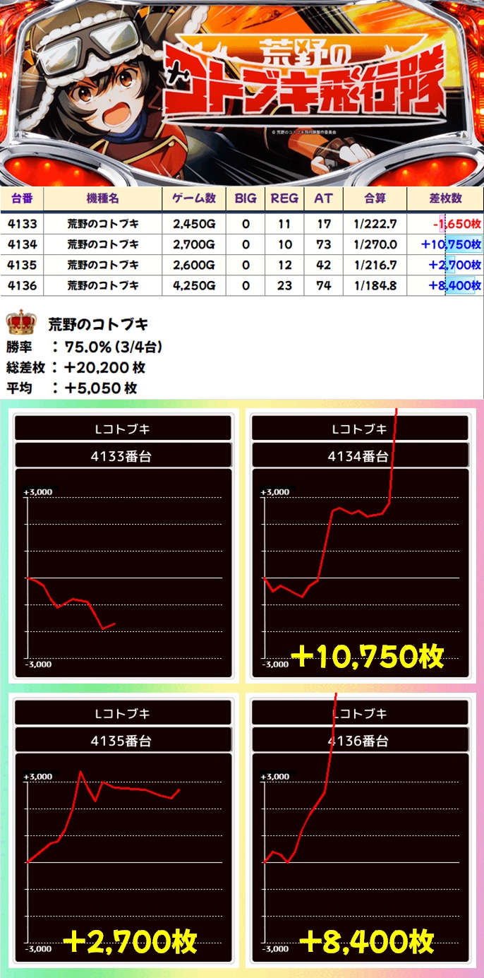 この日は景品関連機種(後述)でもあった荒野のコトブキが全台系濃厚!万枚超も出現し、超優秀結果に!