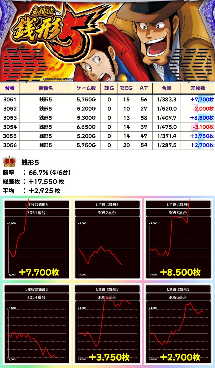 1/2系以上の2機種も好成績!新台系の銭形5も扱いがよさそう!