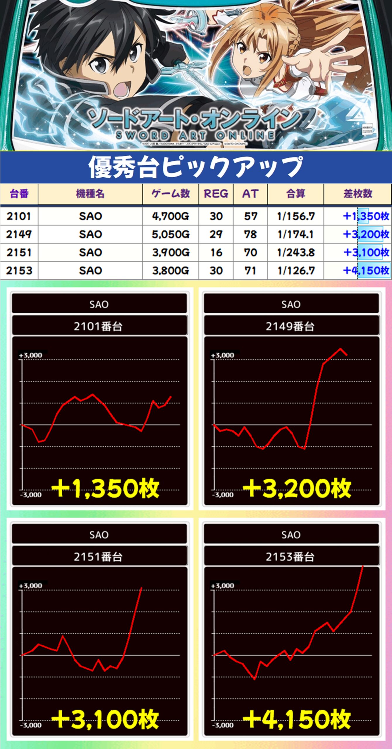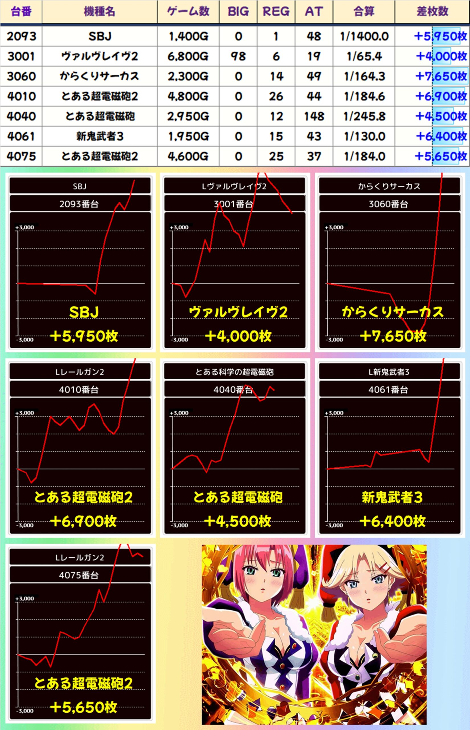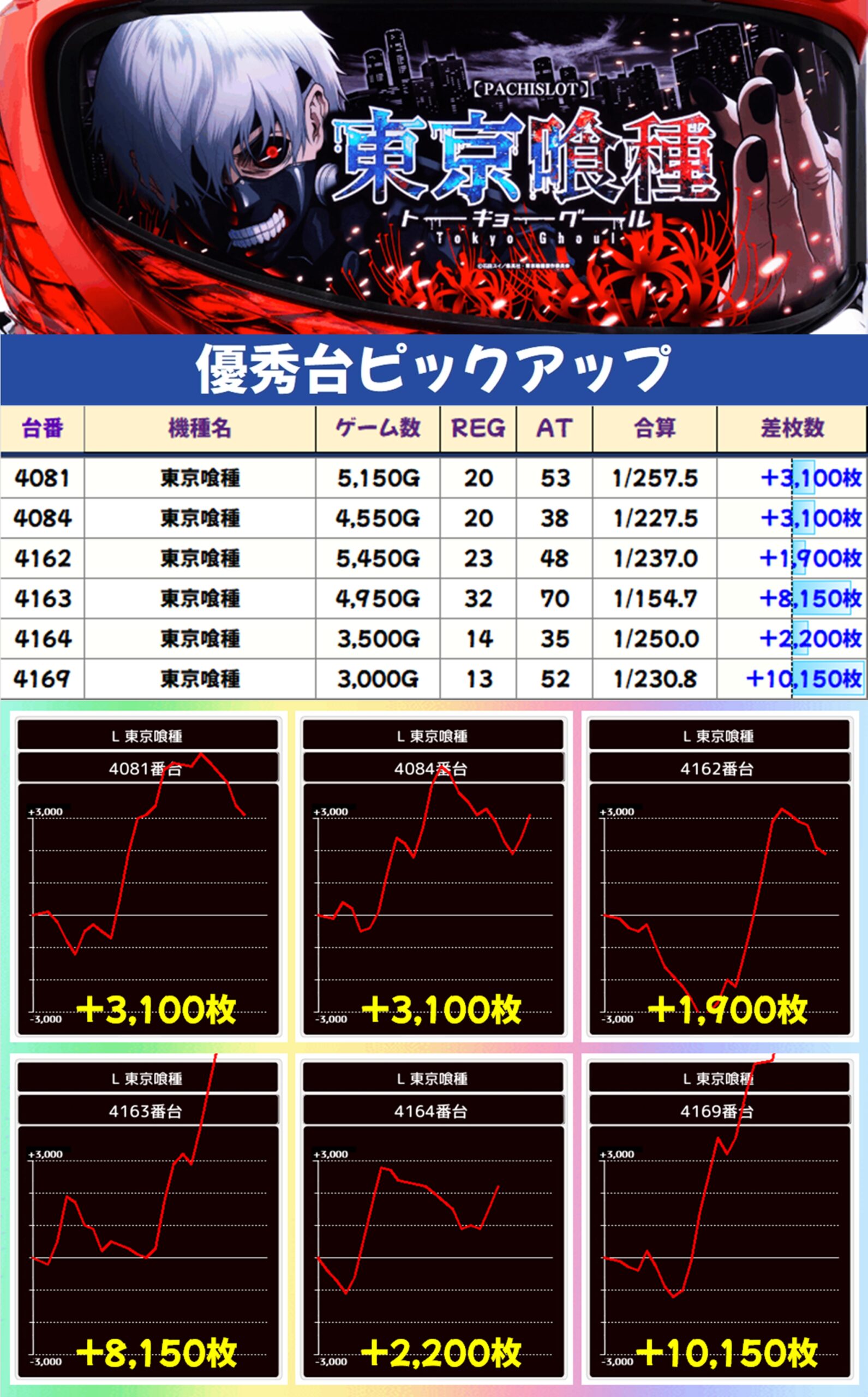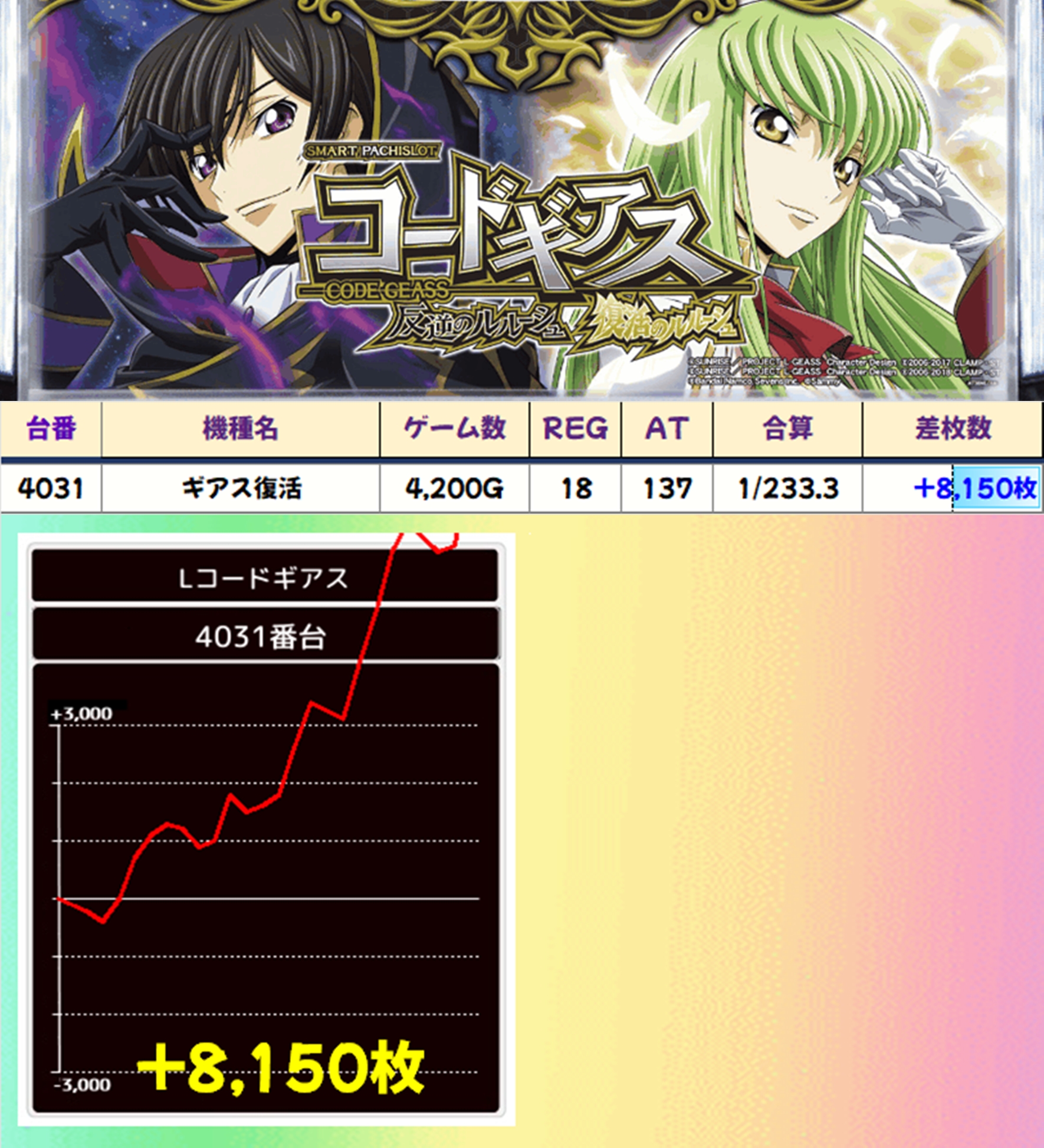 東京喰種、アズールレーン、ギアス復活は増台された機種で、バラエティに導入されたギアス復活は+8150枚と大爆発。東京喰種とアズールレーンからは万枚オーバーの出玉が炸裂しておりました。また、最新台のネオプラからも優秀な出玉アリ!