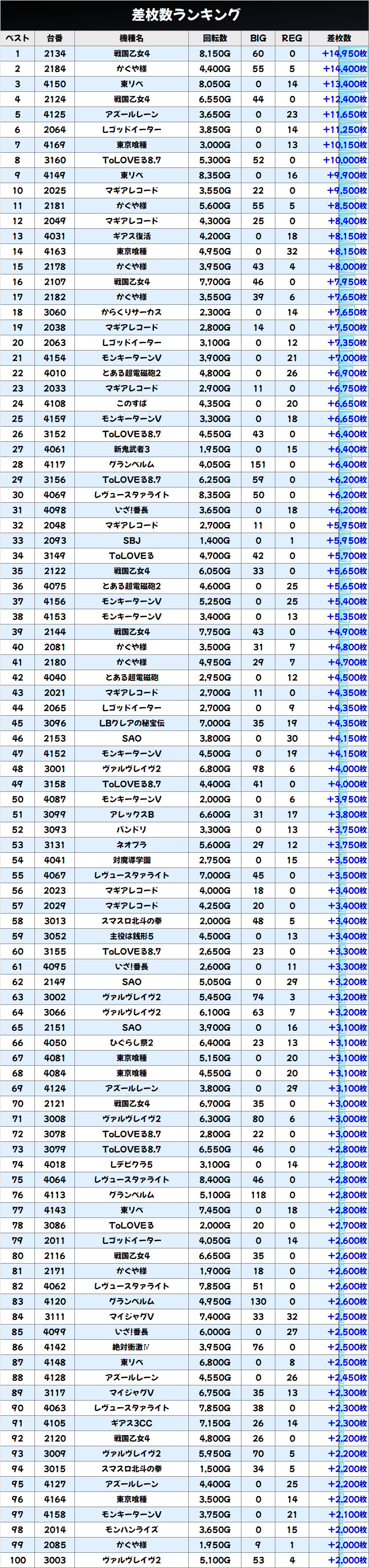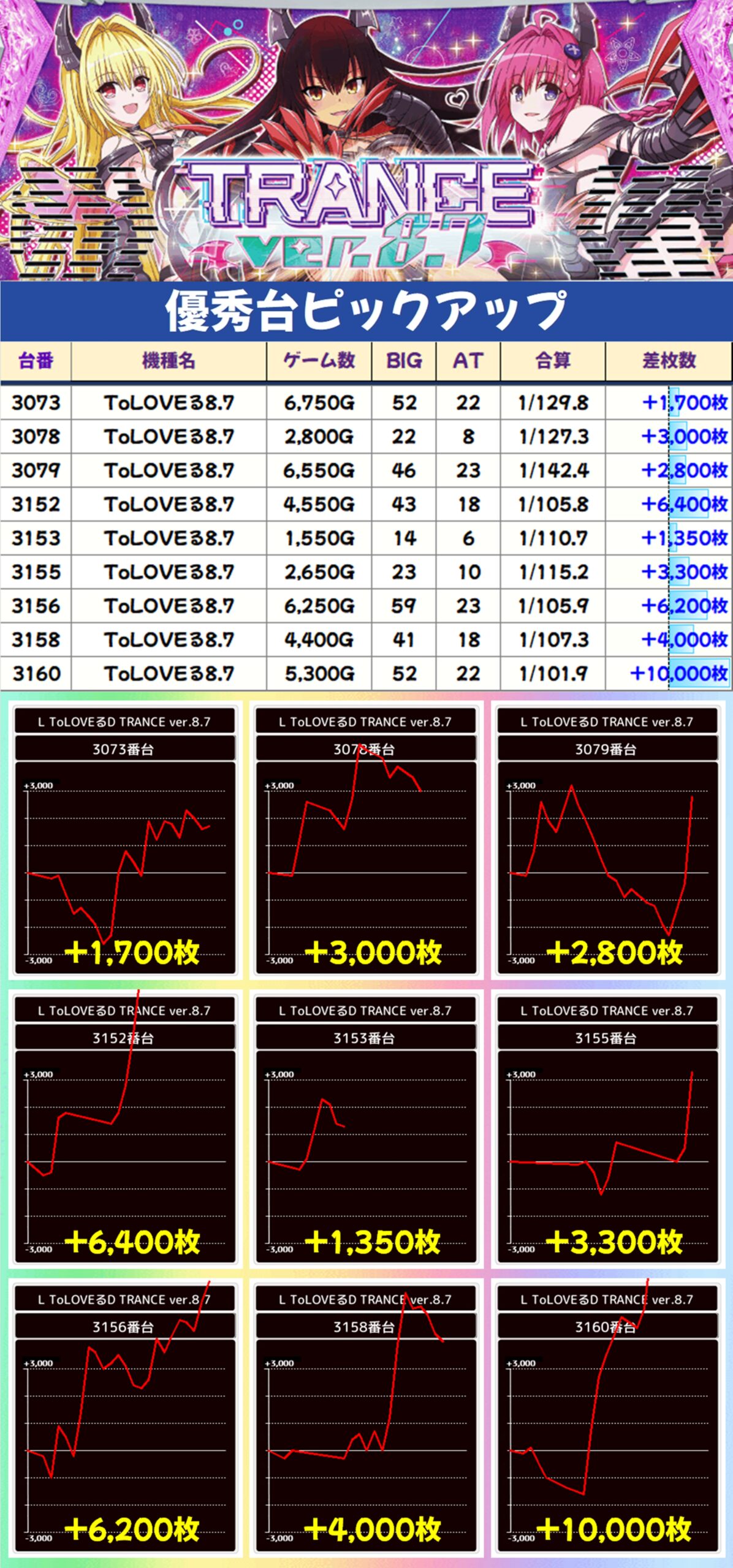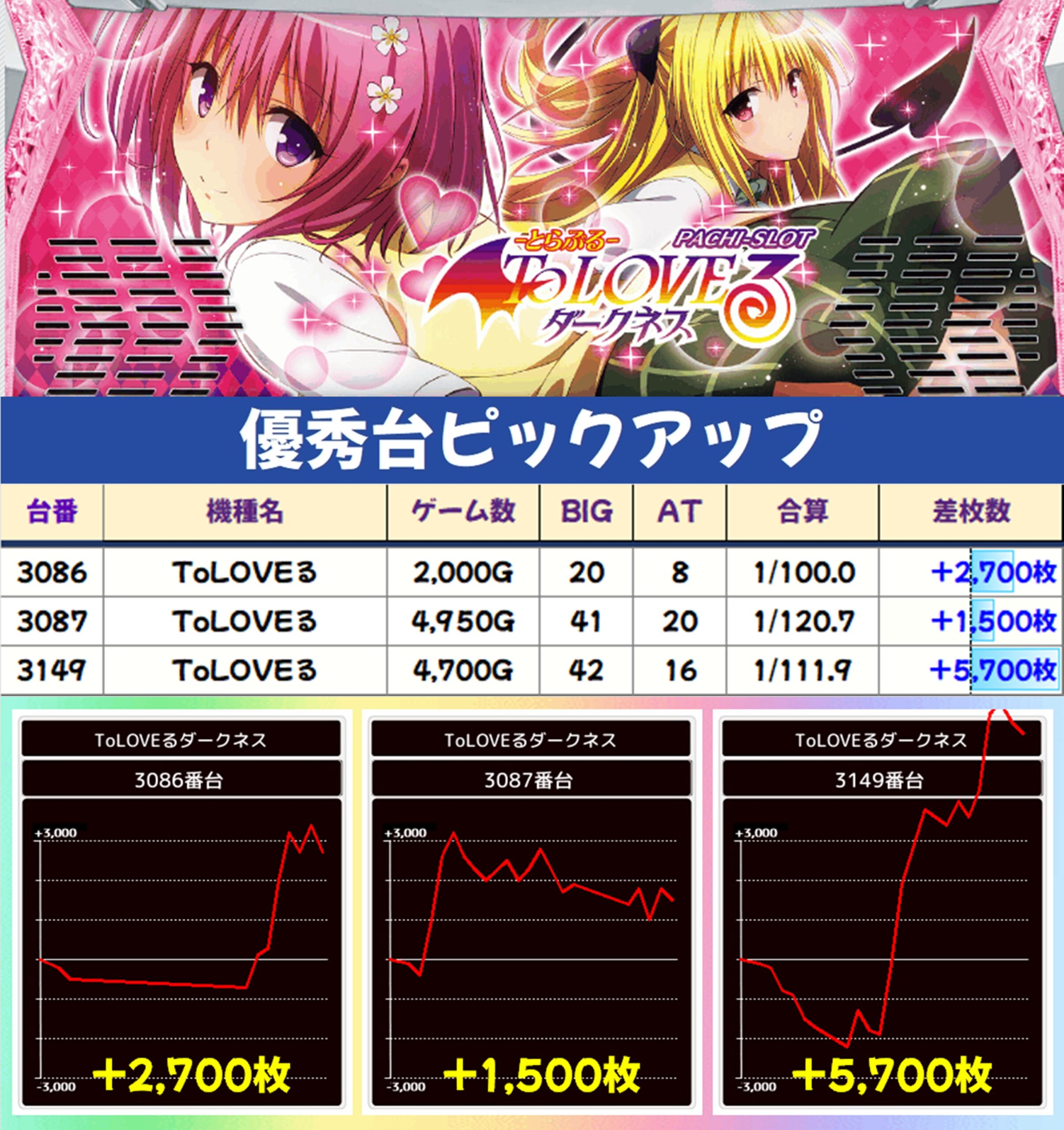 ToLOVEるからも大量出玉を確認でき、こちらも半数に近い台がプラスとなっておりました。
