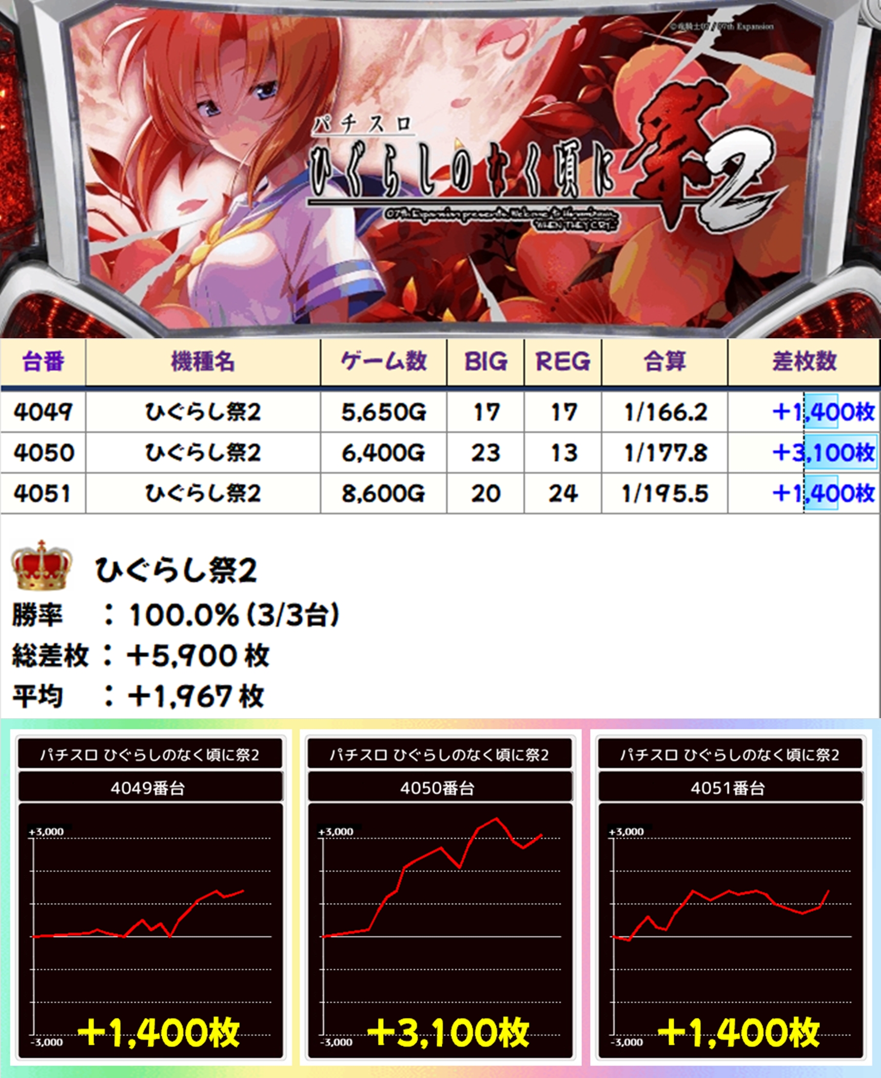 ひぐらし祭2は+3100枚を含めて全台がプラスに。打ち込みのほうもバッチリでしたね!