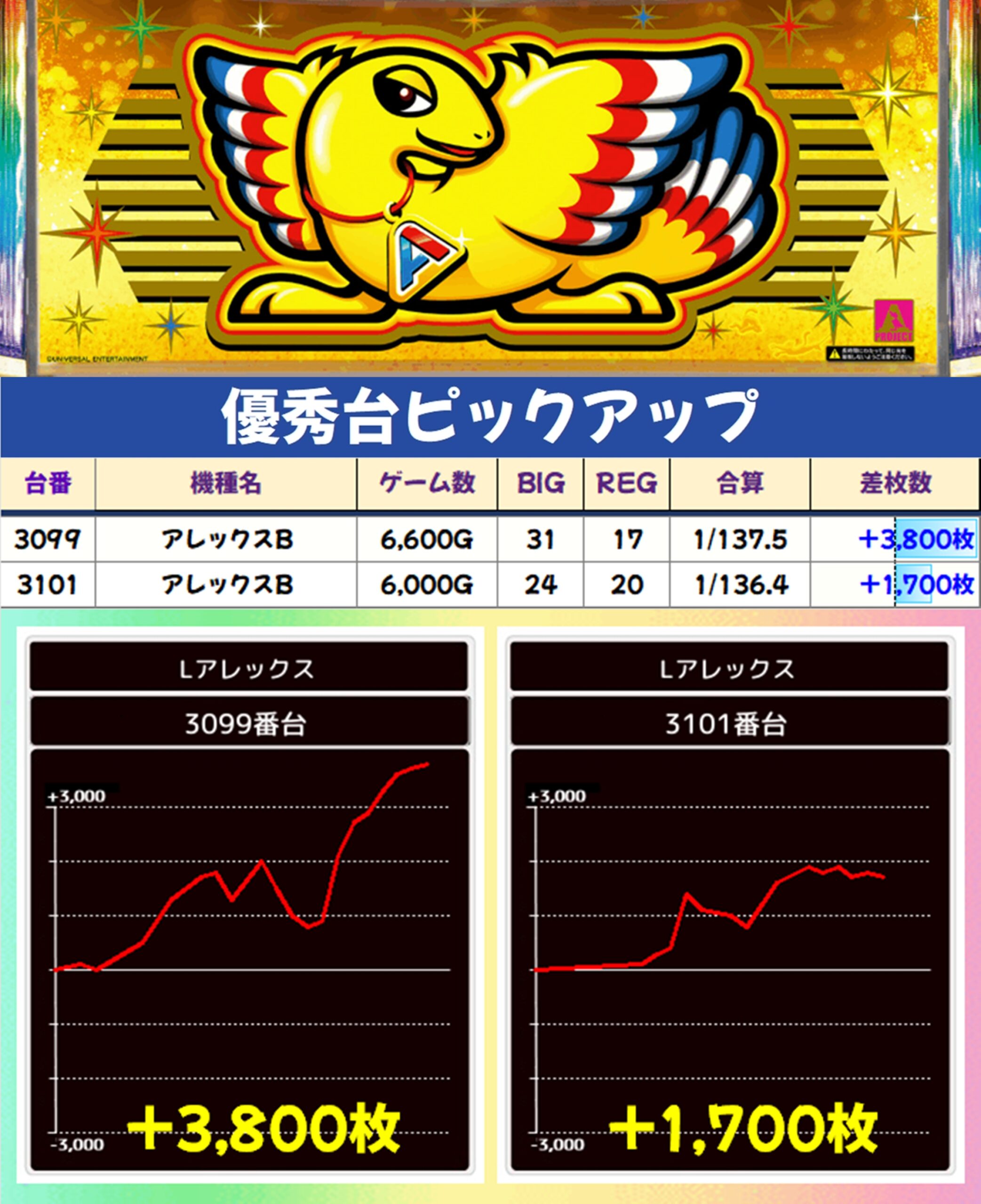 アレックスB(3/4台+)→平均+1,025枚 優秀台ピックアップ