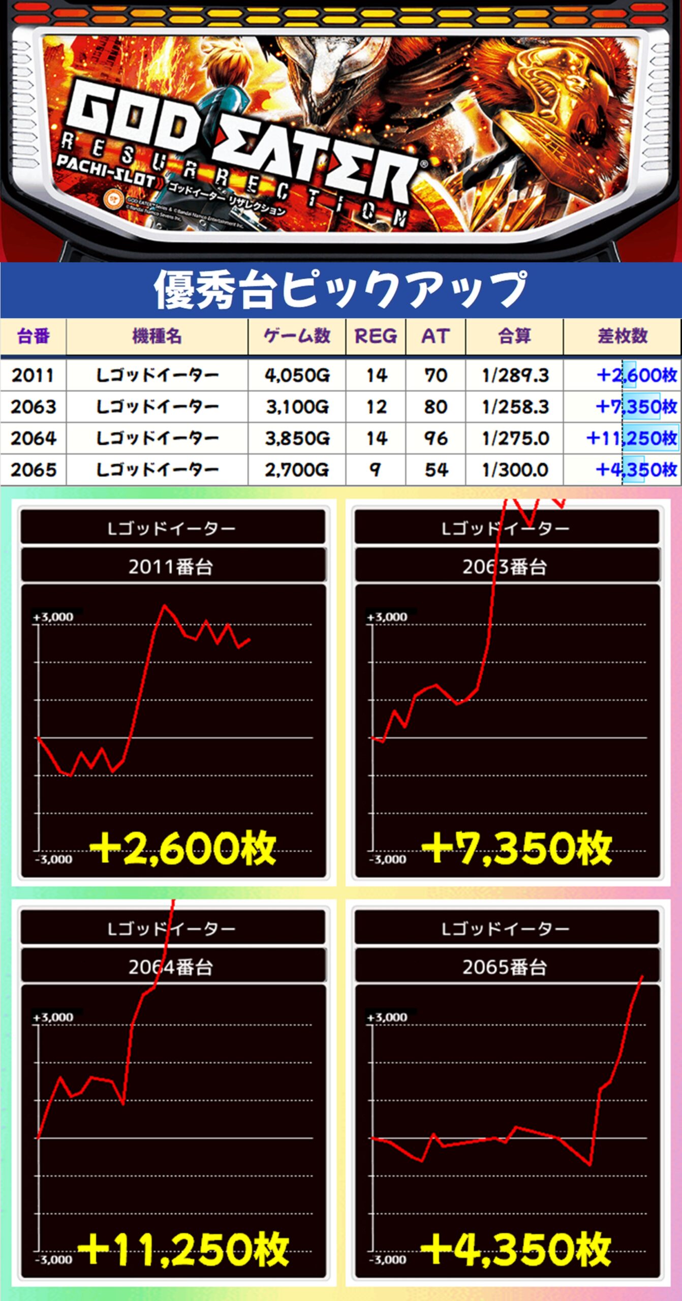ここまで紹介してきた仕掛け以外にも優秀機種は優秀台は盛り沢山。Lゴッドイーターからは+11250枚の万枚オーバーも確認できました。