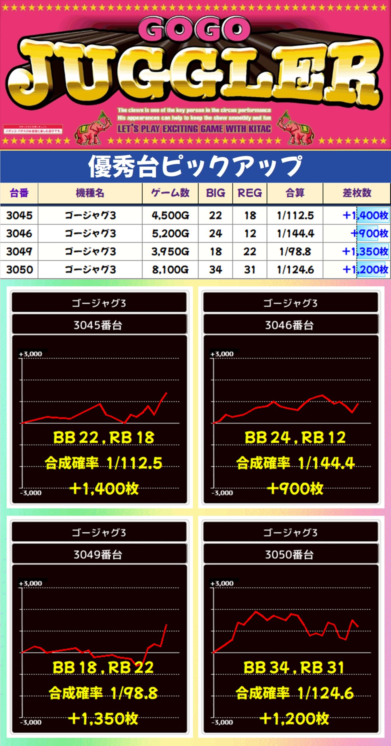 ゴージャグ3(5/6台+)→平均+733枚 優秀台ピックアップ