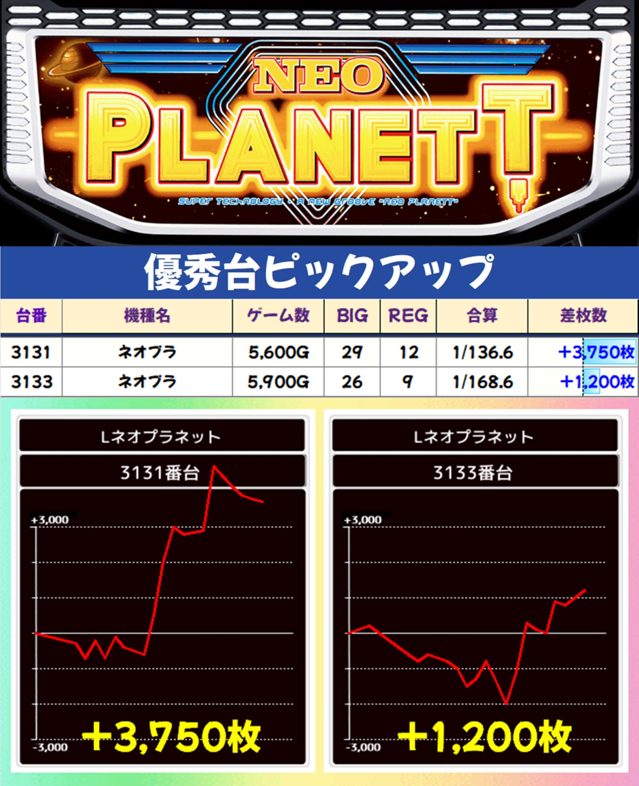 ネオプラ(2/3台+)→平均+417枚 優秀台ピックアップ