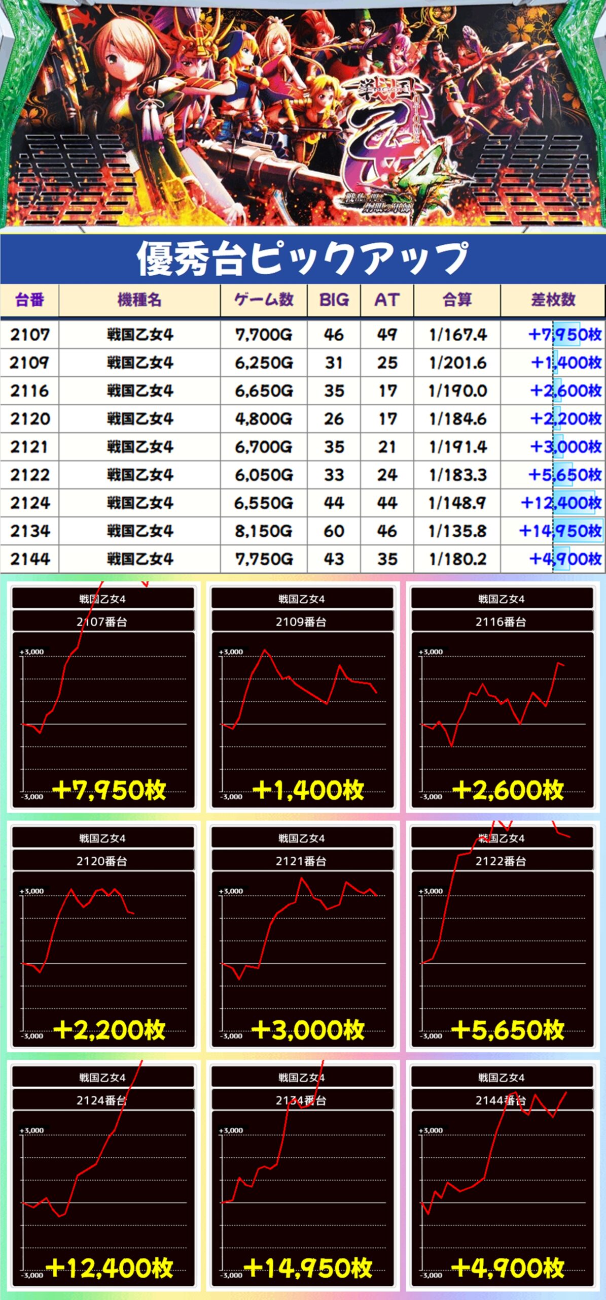 戦国乙女4(14/42台+)→平均+432枚 優秀台ピックアップ