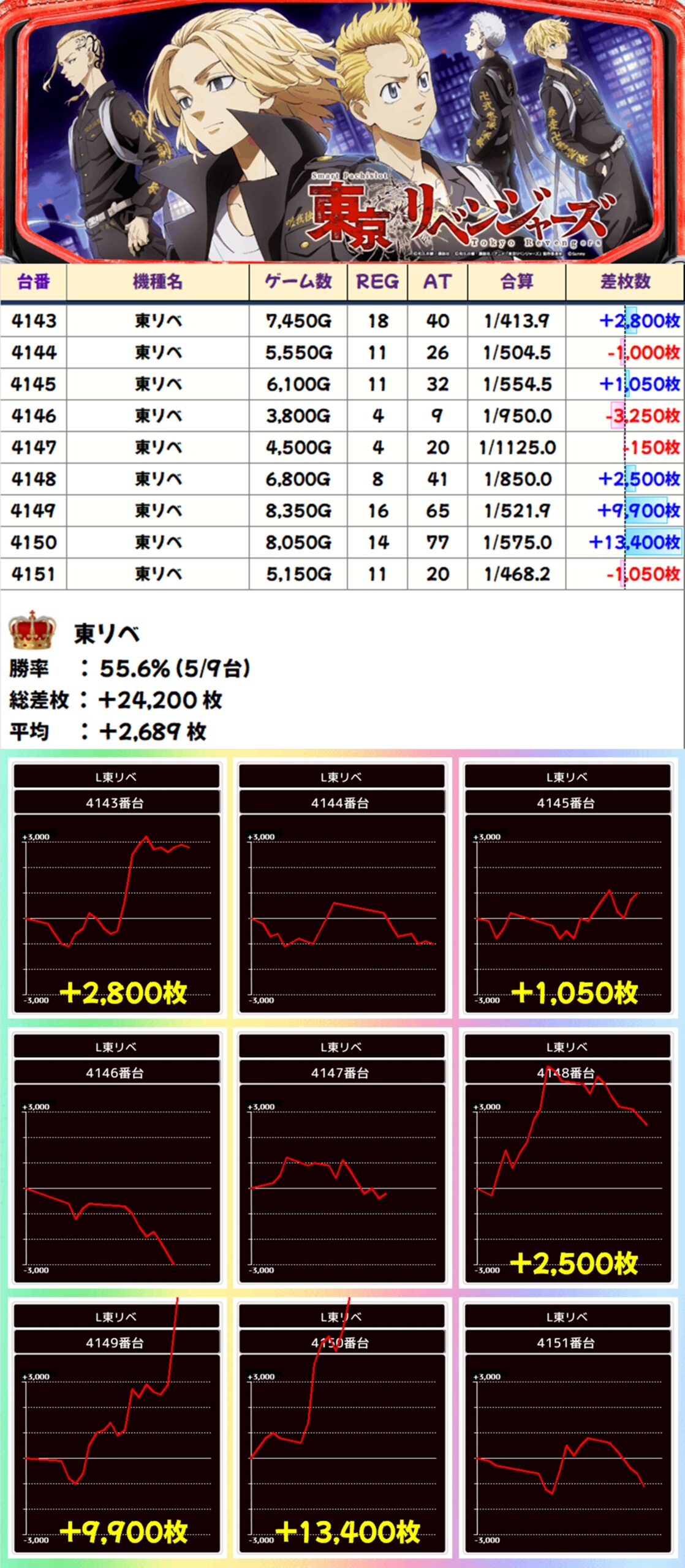 東リベ、このすば、いざ!番長、グランベルム、レヴュースタァライトの5機種は高配分濃厚の結果に。東リベの+13400枚の万枚オーバーを筆頭にいずれの機種からも優秀な出玉を確認することができました。