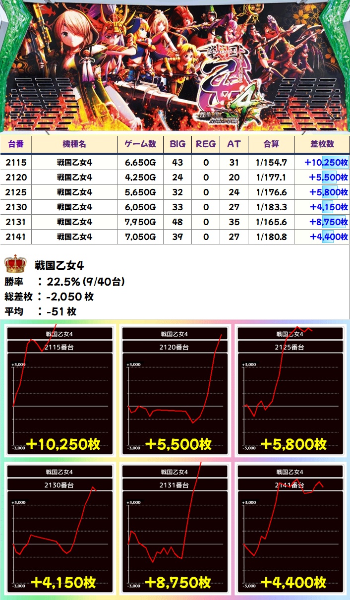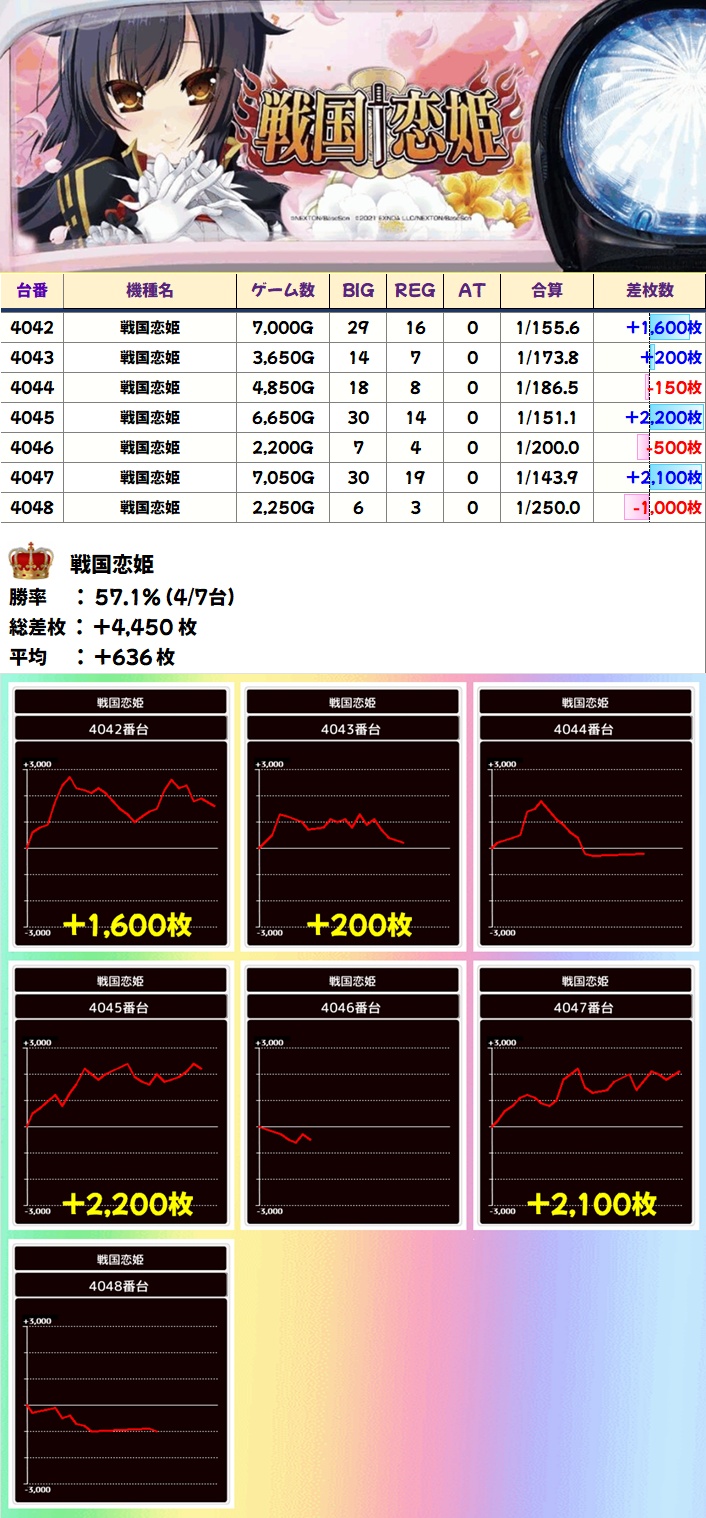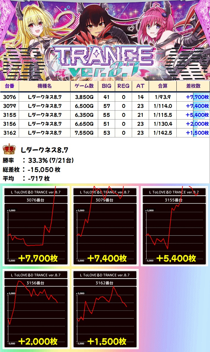 こちらも特日問わず優秀台がある人気機種。ここにも大量獲得台が多数あり、特にToLOVEるシリーズが出玉を伸ばしました。普段から強いエリアに黒閃も重なれば高ベースなのは間違いないでしょう!