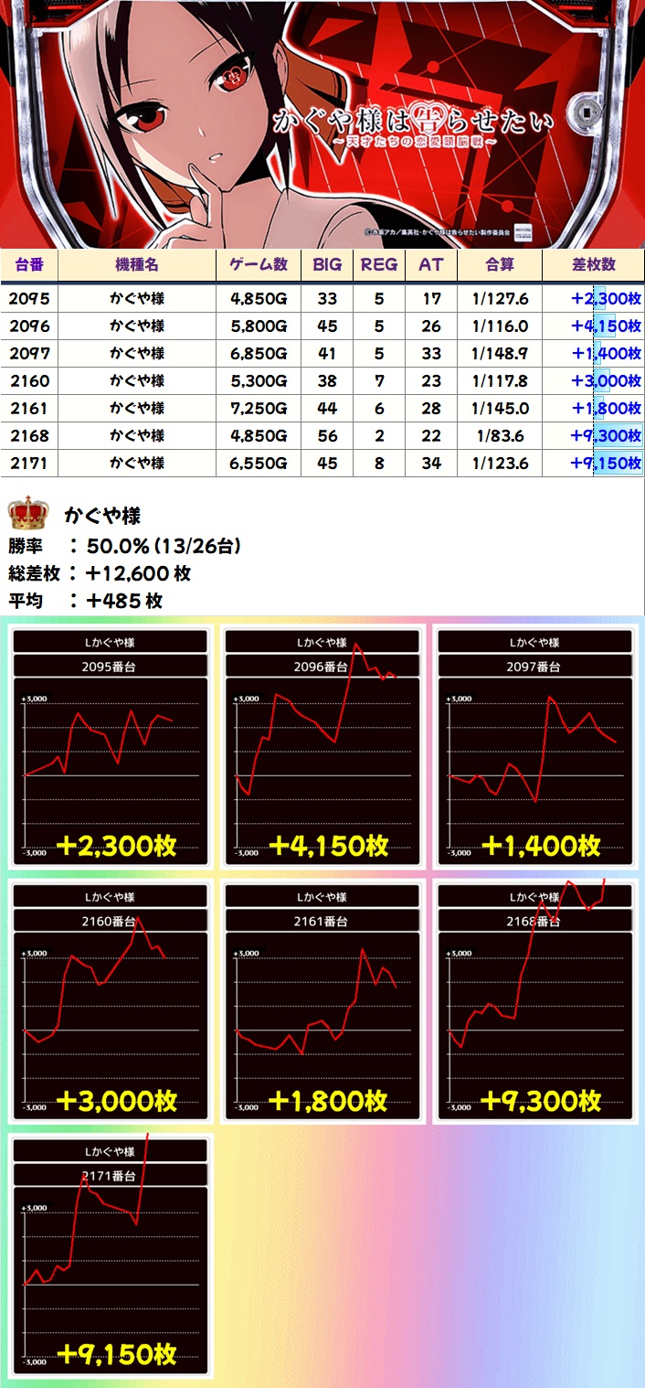 特日を問わず毎日優秀台が確認されているAKIBA神3機種!黒閃時は高ベースになっていることも多く、今回は乙女4とかぐや様から万枚クラスを複数確認!台数が多く狙いは絞りづらいですが、迷った際には狙いたいエリアですよ!