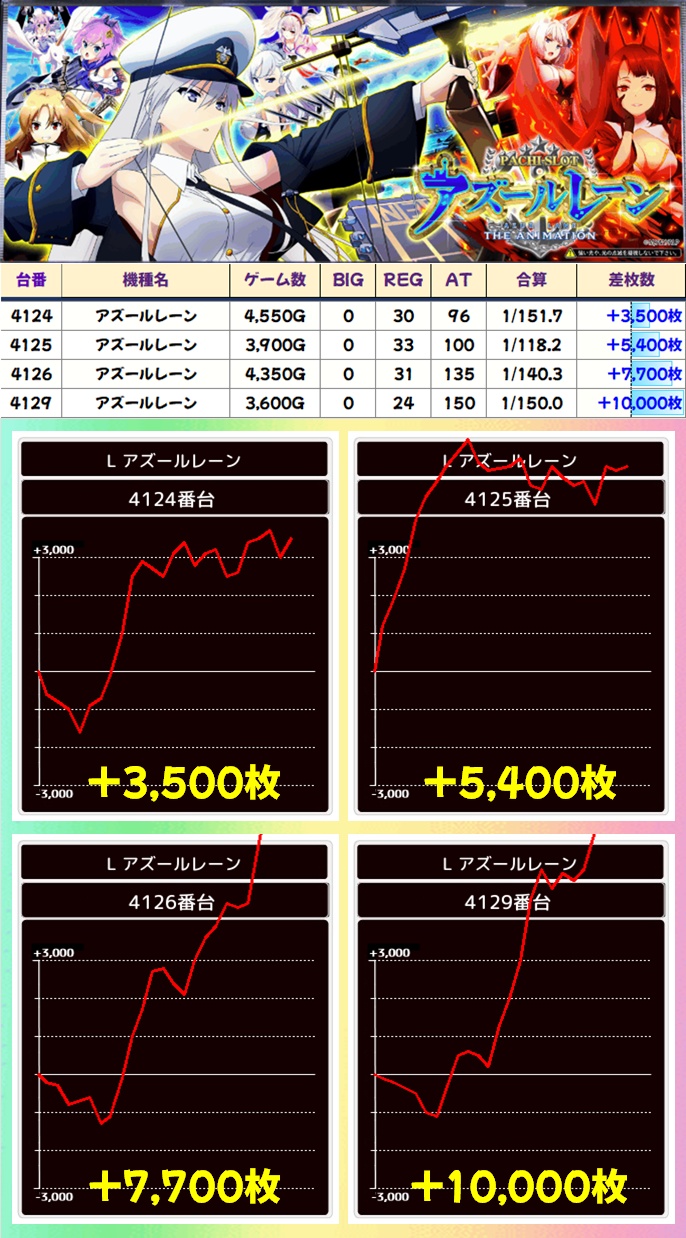 ゴッドイーターとアズレンは高配分以上だったようで、どちらもお宝台は万枚超の優秀成績!ゴッドイーターは6000枚超の優秀台も複数あり!
