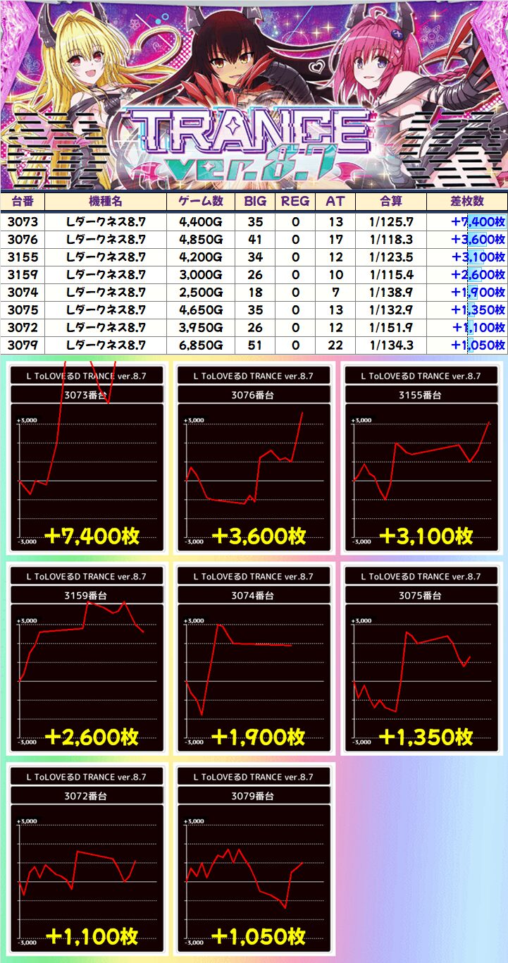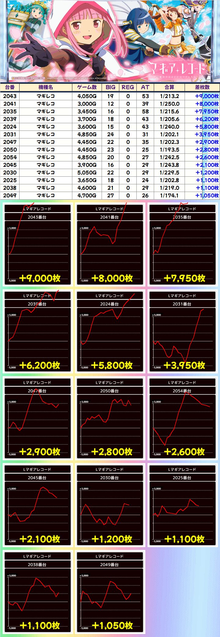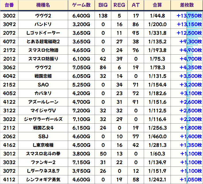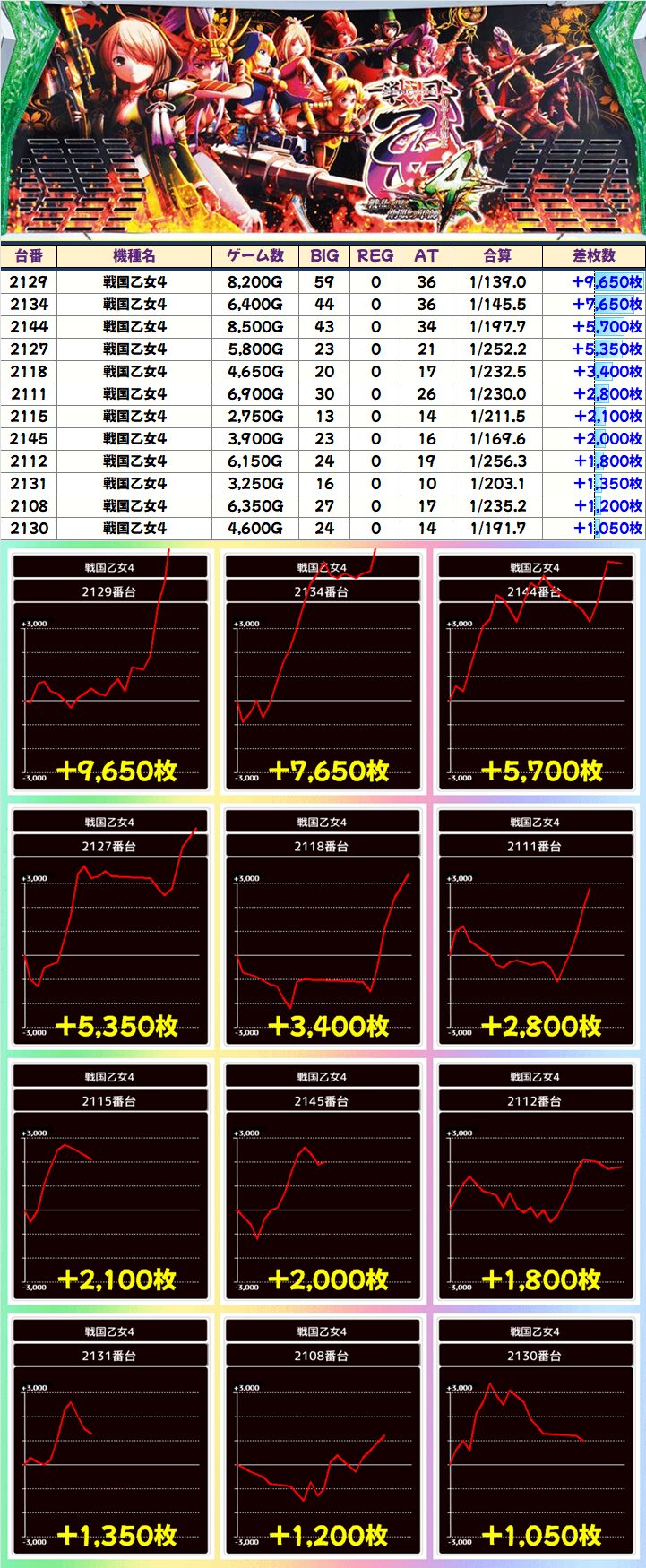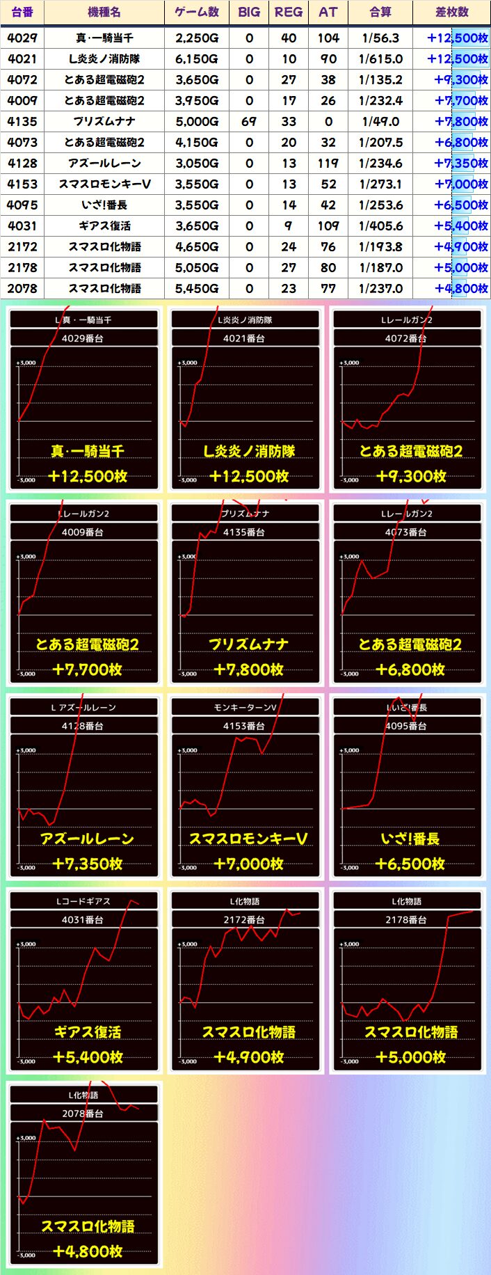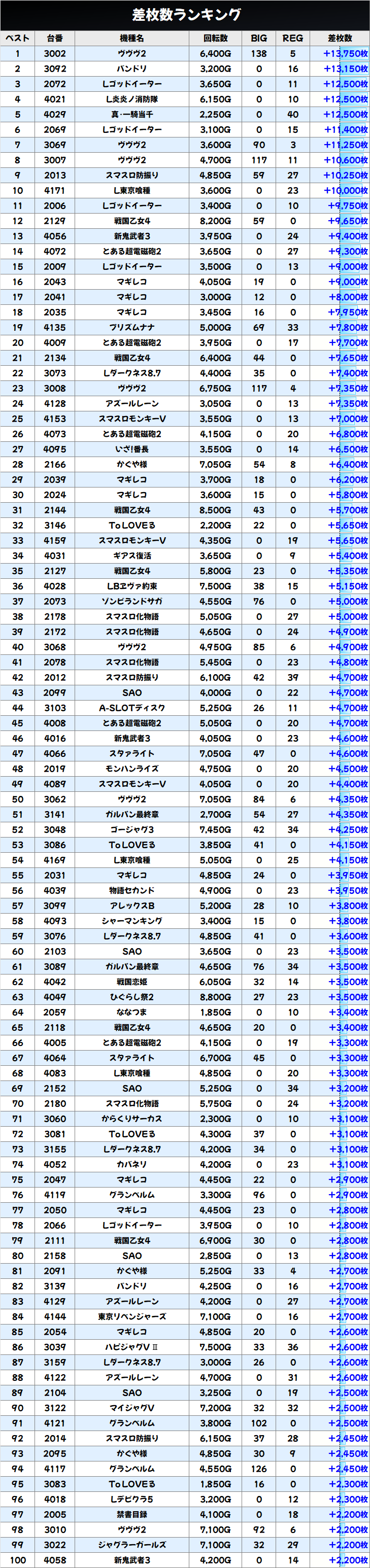 +9400枚を筆頭に半数近い5台が+1000枚を突破!