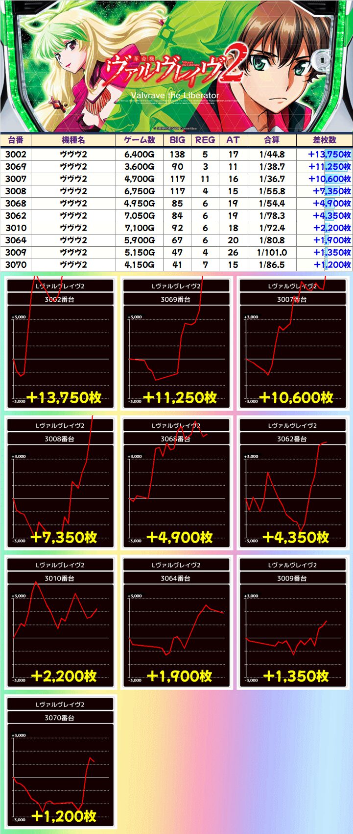 最新機種「ヴヴヴ2」は万枚オーバー3台を筆頭に約半数の10台が+1000枚を突破!