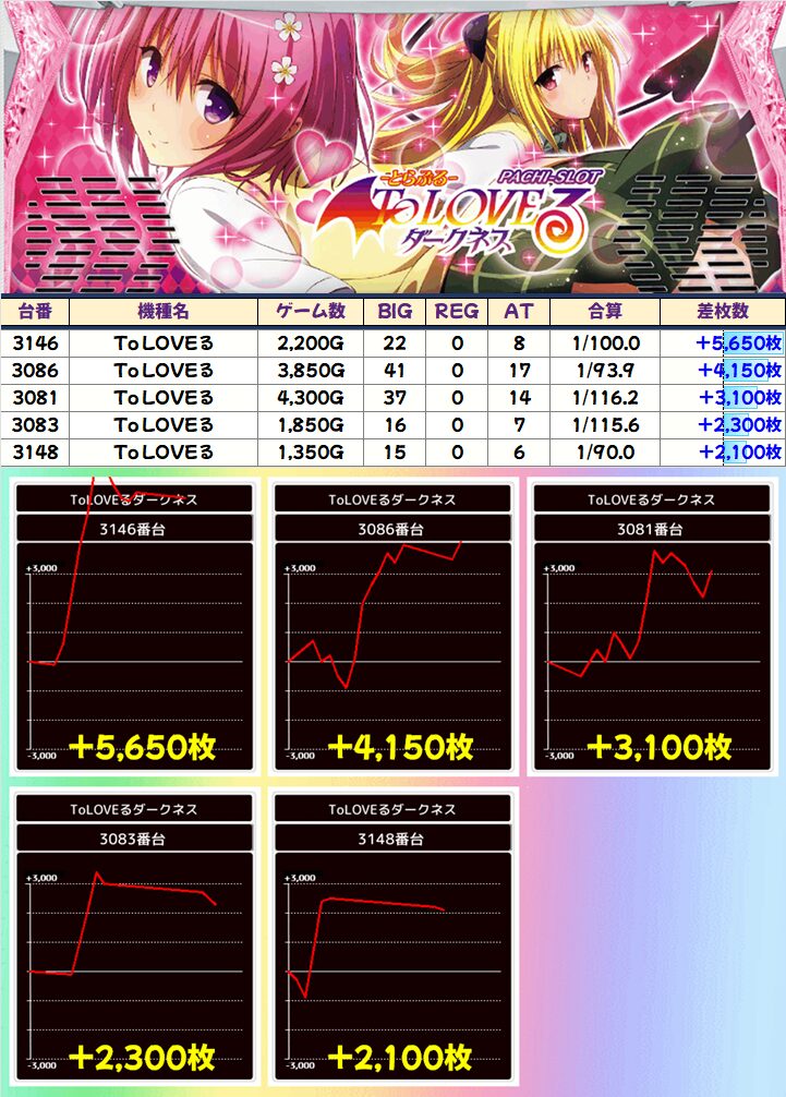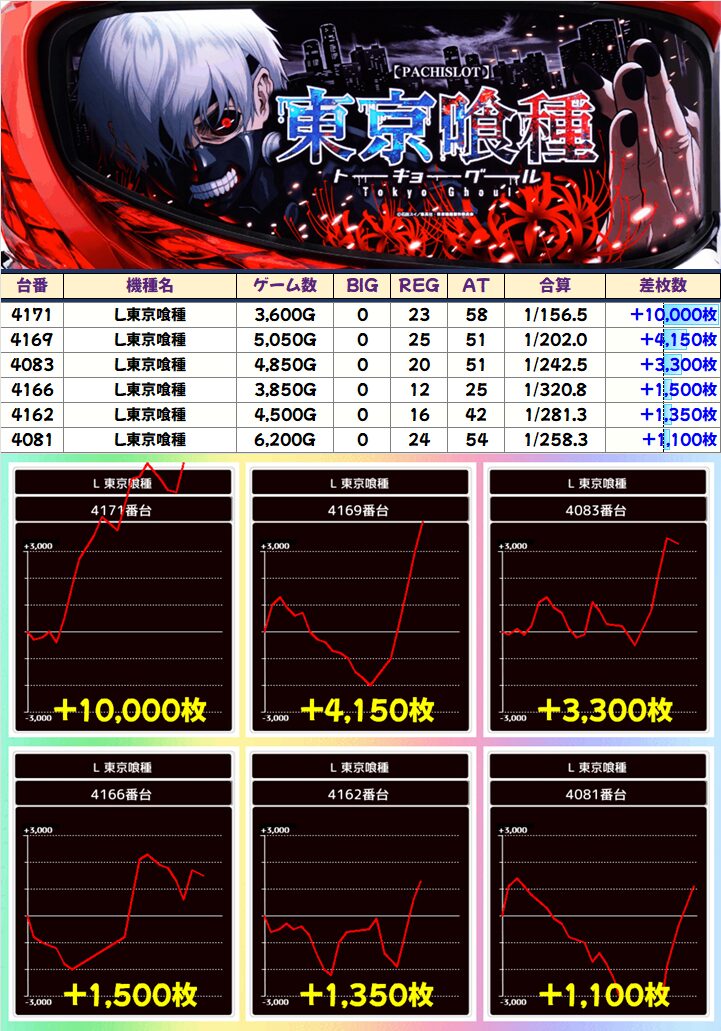 36台の「マギレコ」、20台以上設置の「L東京喰種」、「To LOVEるシリーズ」と大量設置の4機種が出玉充実!多くの機種が5台並びにも絡んでいました!