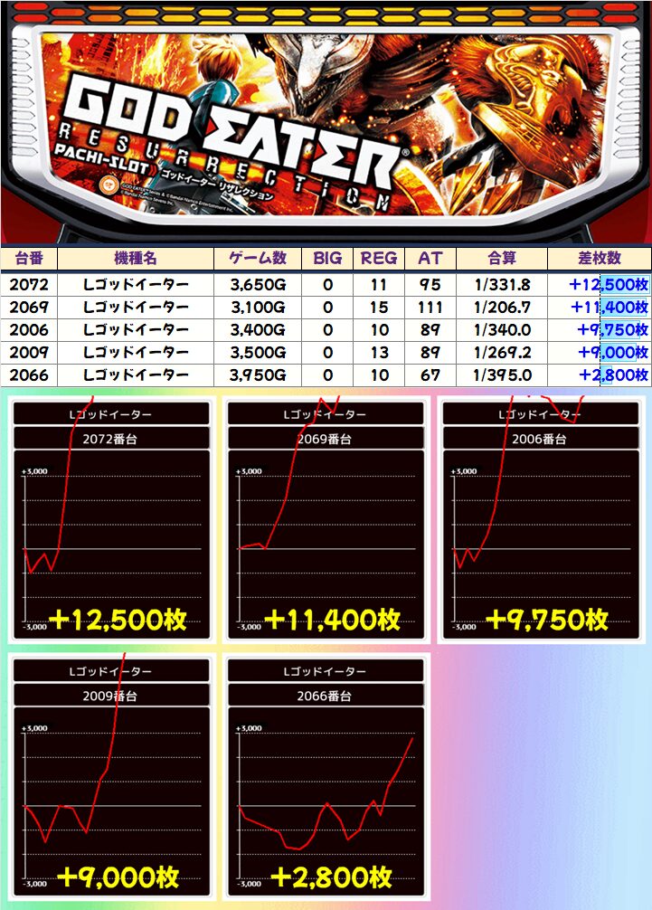 「ゴッドイーター」は万枚オーバーが2台、+9000枚クラスが2台と12台中4台が異次元の爆発!