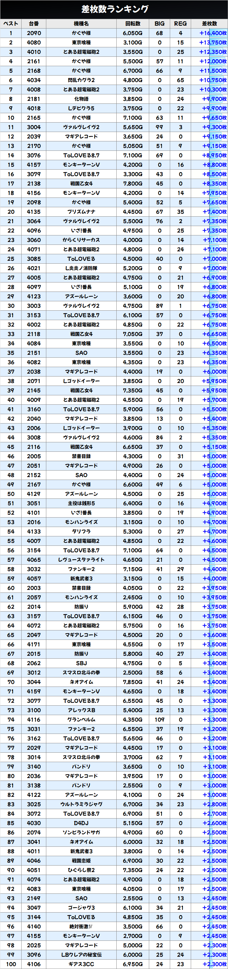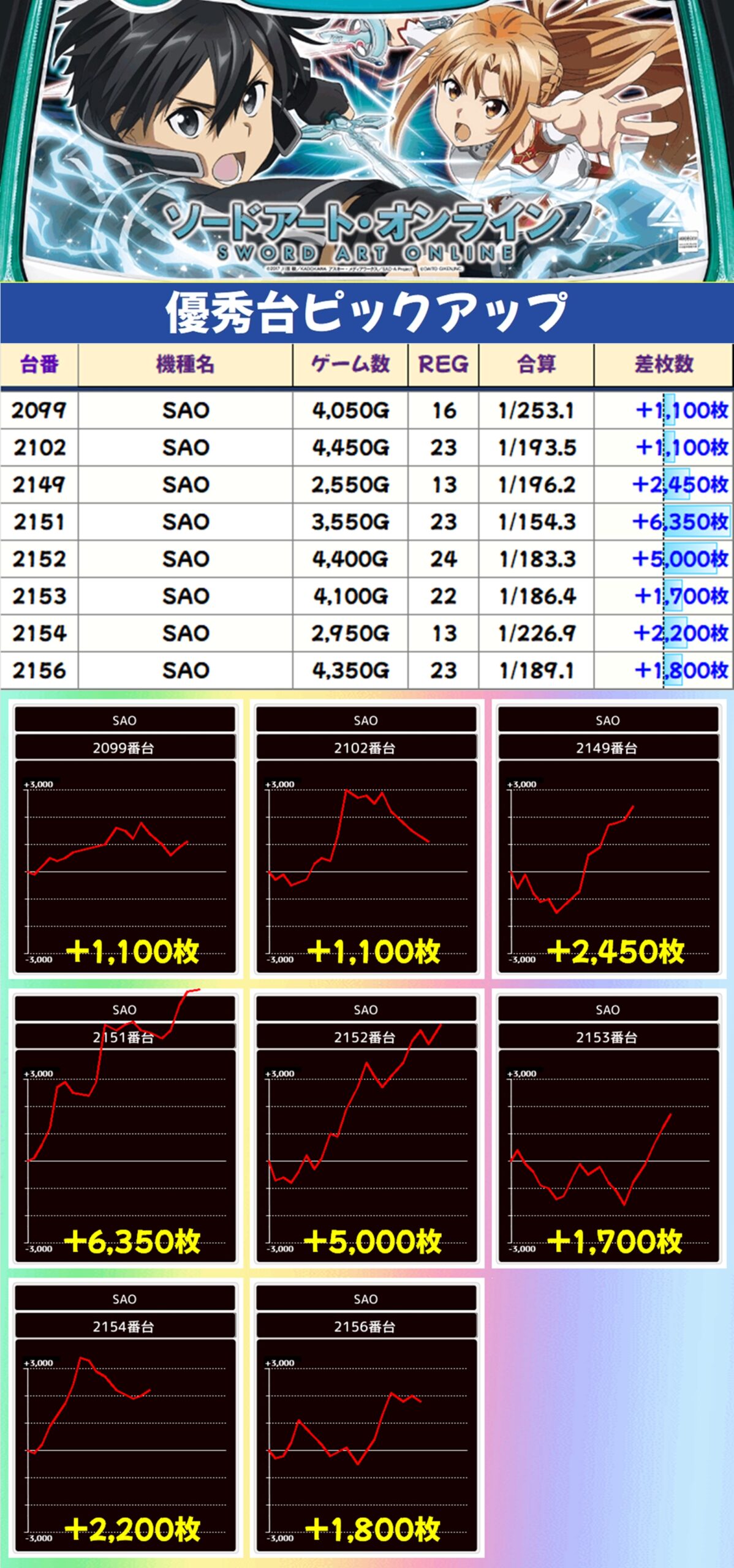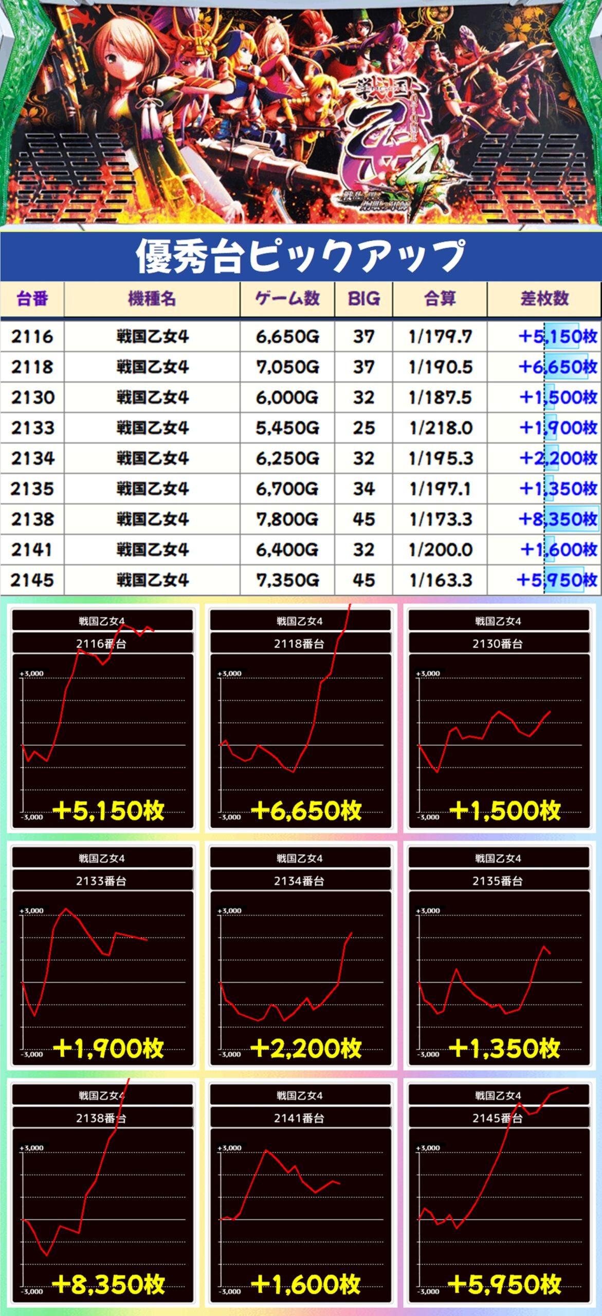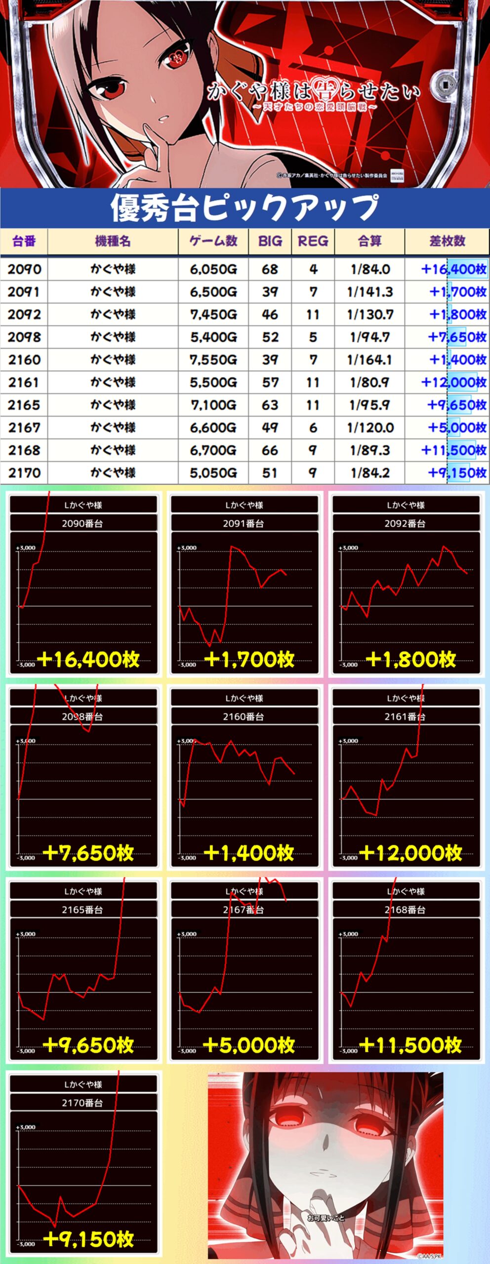 アキバの神3、かぐや様、戦国乙女4、SAOからも優秀な出玉が多数アリ!特にかぐや様からは+16400枚、+12000枚、+11500枚と万枚オーバーの爆裂が3台も出現しました。