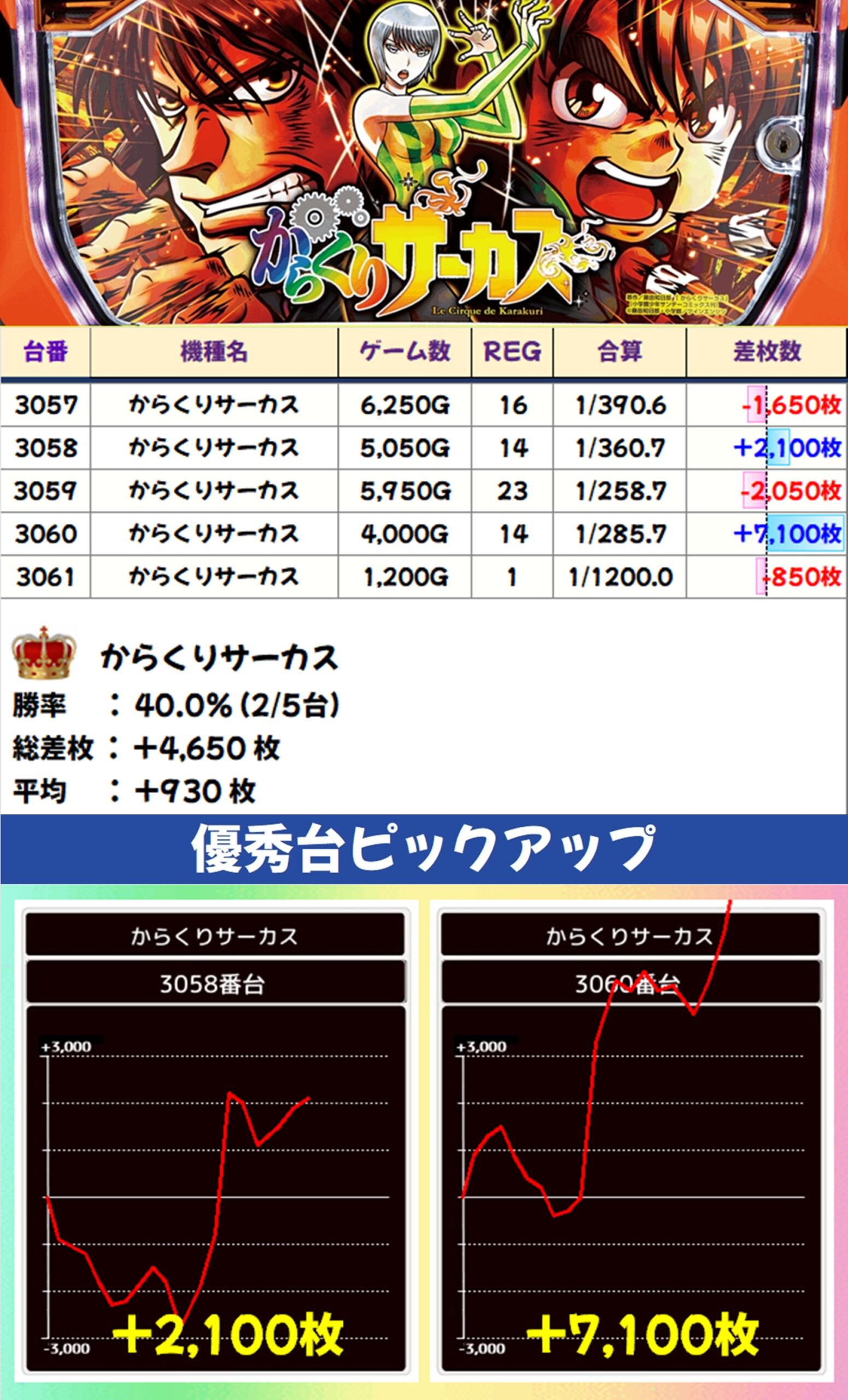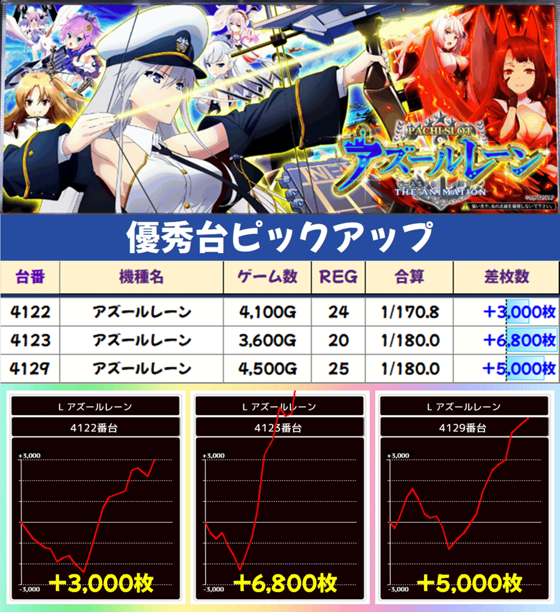 また、パチンコ導入の絡みでアズールレーン、スマスロ北斗の拳、からくりサーカスからも優秀な出玉が出現。最新台導入だけでなく、同じシリーズのパチンコ導入がある場合などは狙い目になると言えますね!