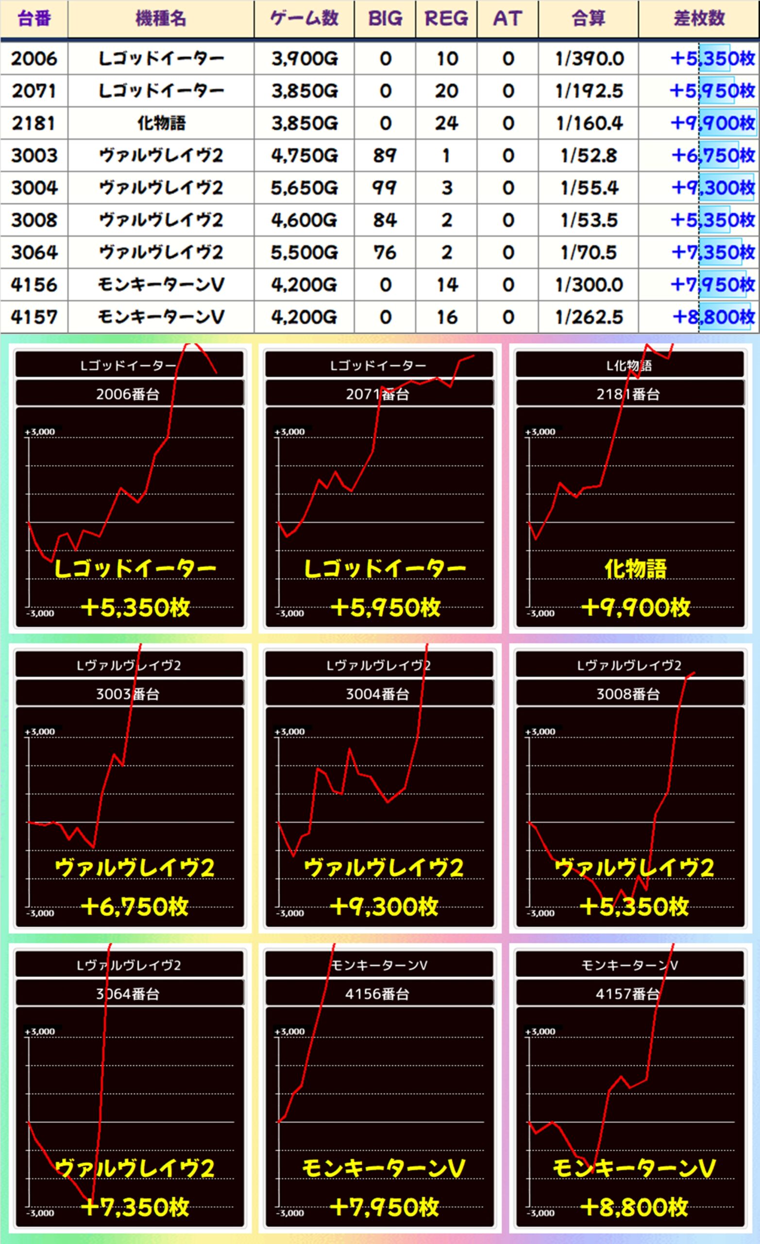 多くの仕掛けに加えて、単品でのお宝台も多数出現。ヴァルヴレイヴ2やモンキーターンV、新台の化物語などから目を見張る出玉が出現しておりましたね!