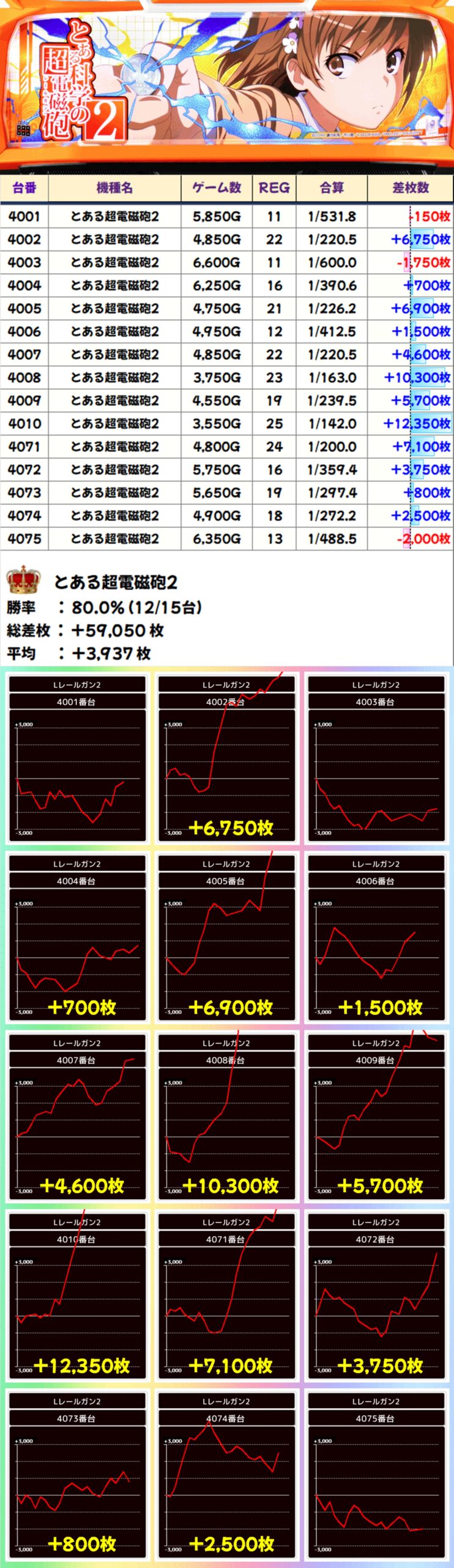 とあるシリーズのとある超電磁砲2と禁書目録は全台系濃厚!とある超電磁砲2からは+12350枚、+10300枚と万枚オーバーが爆裂が2台出現し、その他にも大量出玉が続出。平均約+4000枚という圧巻の好成績となりました。