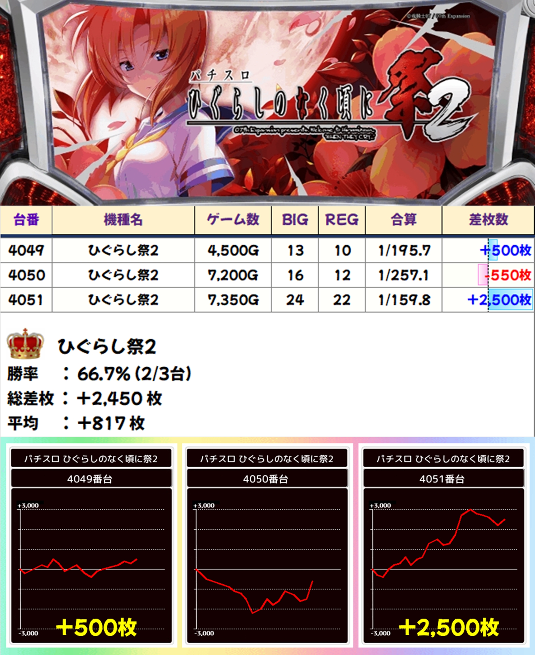 優秀な結果を残した機種は他にも多数あり、幅広い機種にお宝台を期待できます。今回は、Lデビクラ5、L炎炎ノ消防隊、ダリフラ、ひぐらし祭2からそれぞれ優秀な出玉を確認できました!