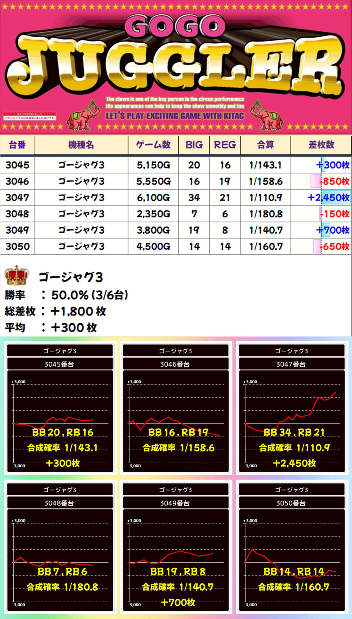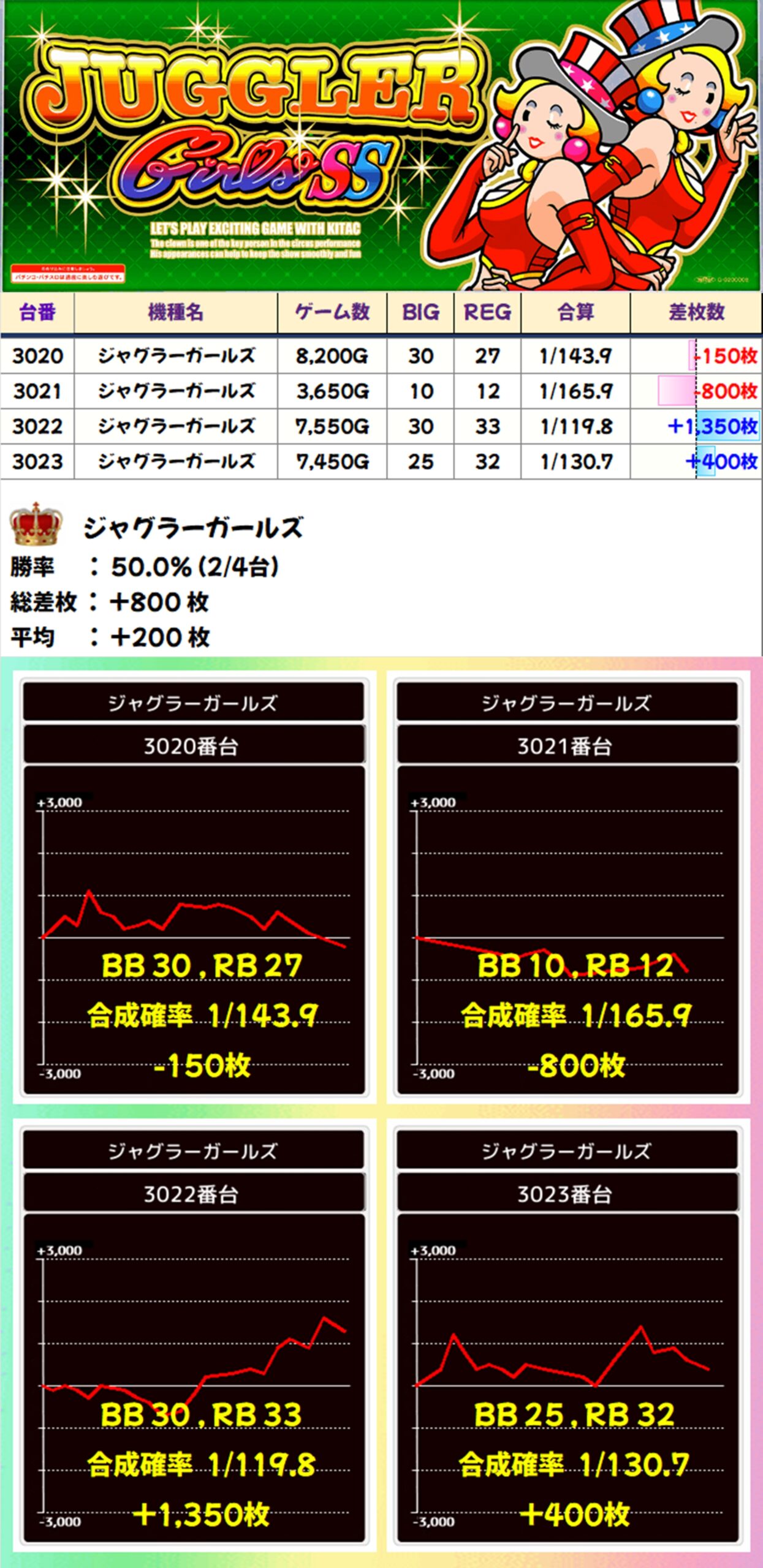 ネオアイム、ウルトラミラジャグは全台がプラスとなり、ファンキー2,ジャグラーガールズ、ゴージャグ3からもお宝台を多数確認。不発の台やREG先行でマイナスとなった台もありましたが、これらのジャグラーシリーズには全台系の仕掛けがあったようでした。