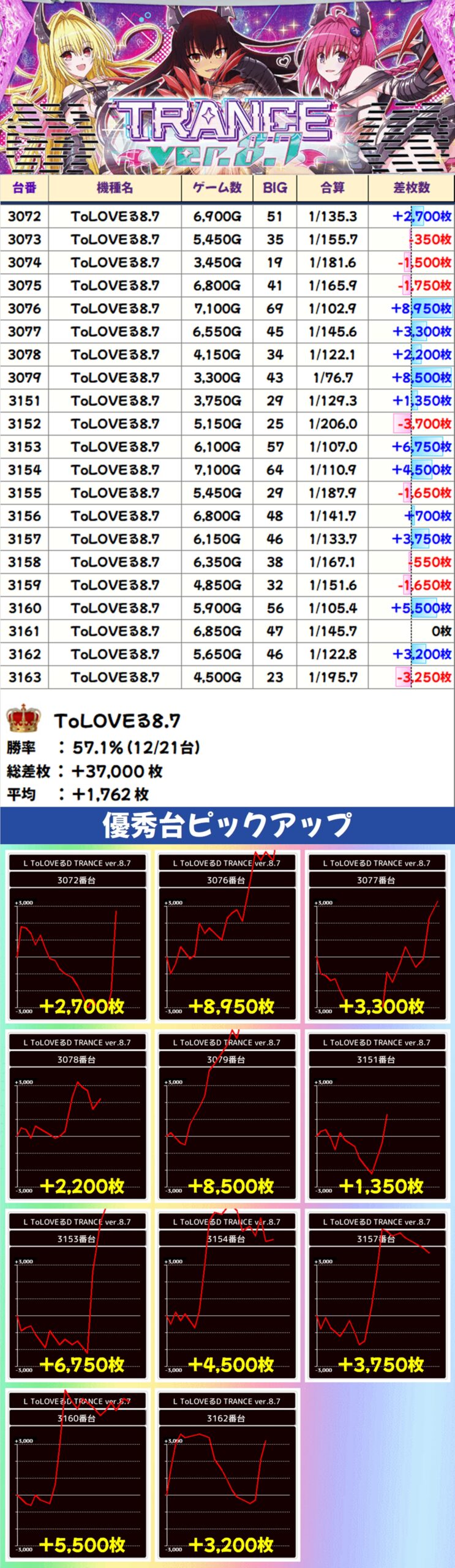 ToLOVEる8.7(12/21台+)→平均+1,762枚
