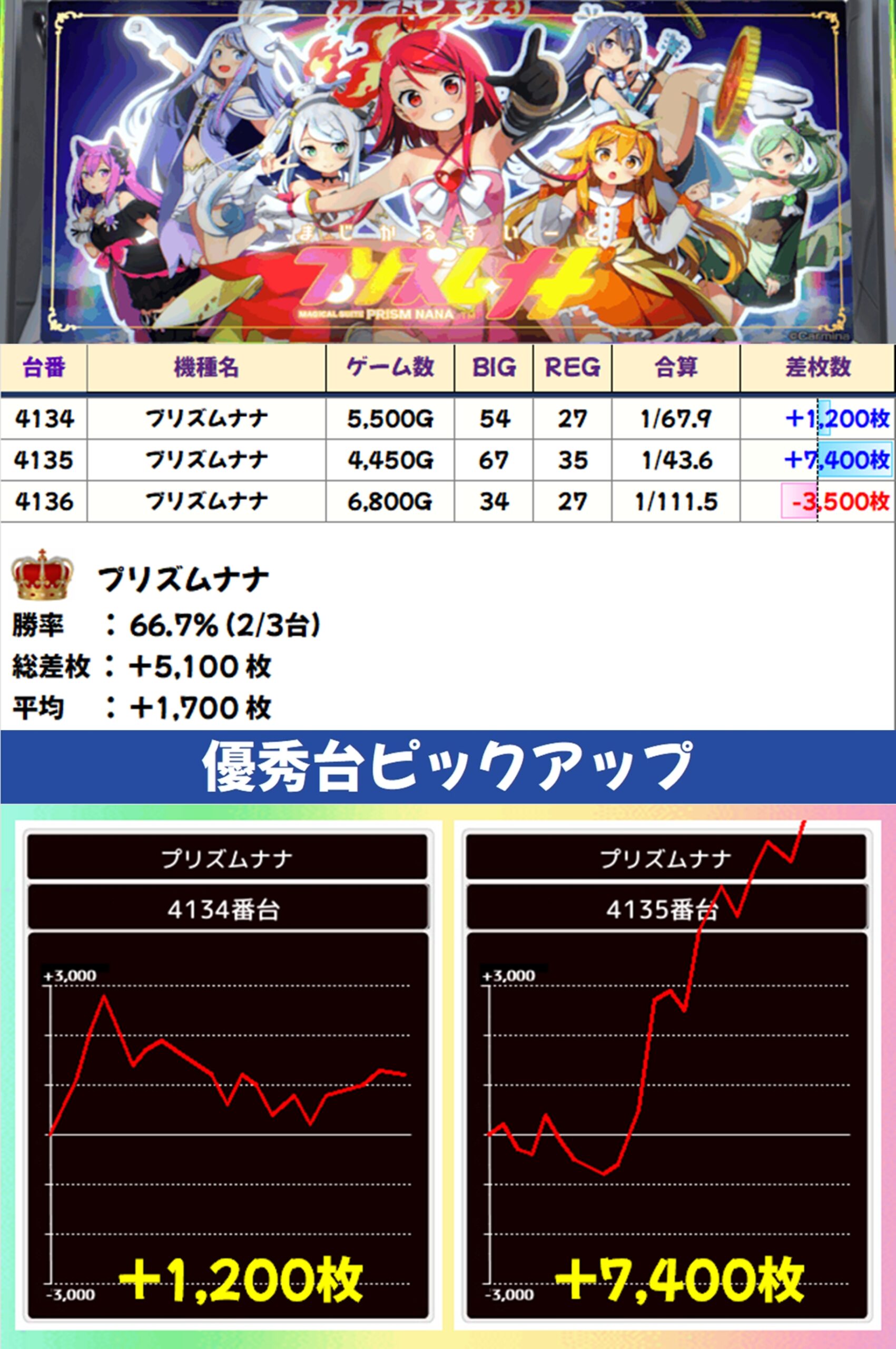 最新台や増台機種には力を入れる傾向があり、プリズムナナから+7400枚の爆発台を確認。