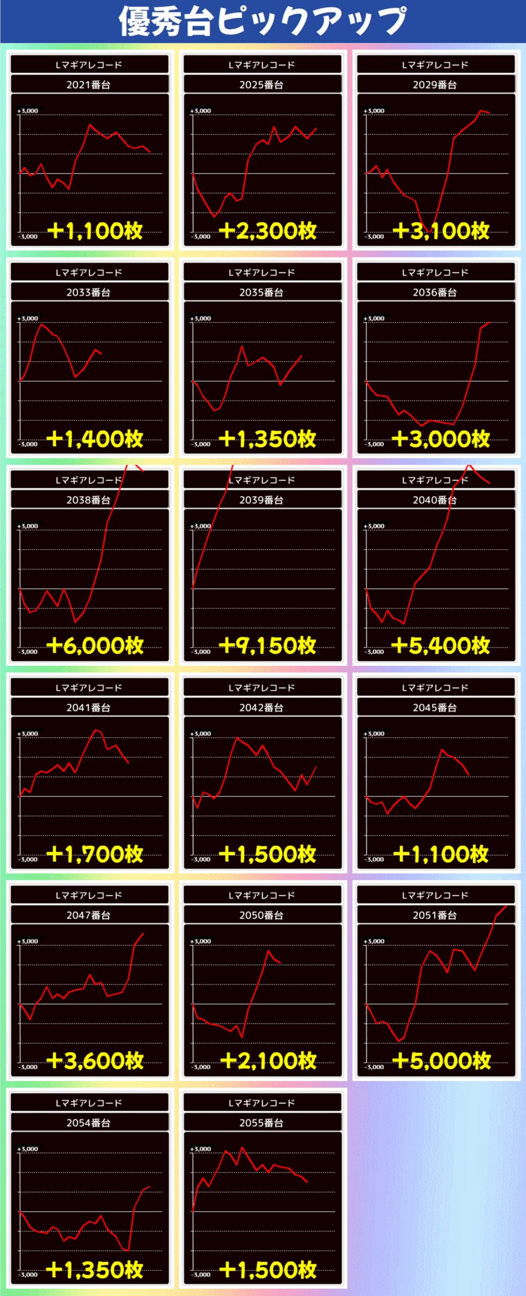 この日は+16400枚の大爆発を筆頭に万枚オーバーが7台も出現!そして50台が+5000枚以上の出玉を獲得し、ホール内の至る所で盛り上がりを見せておりました!