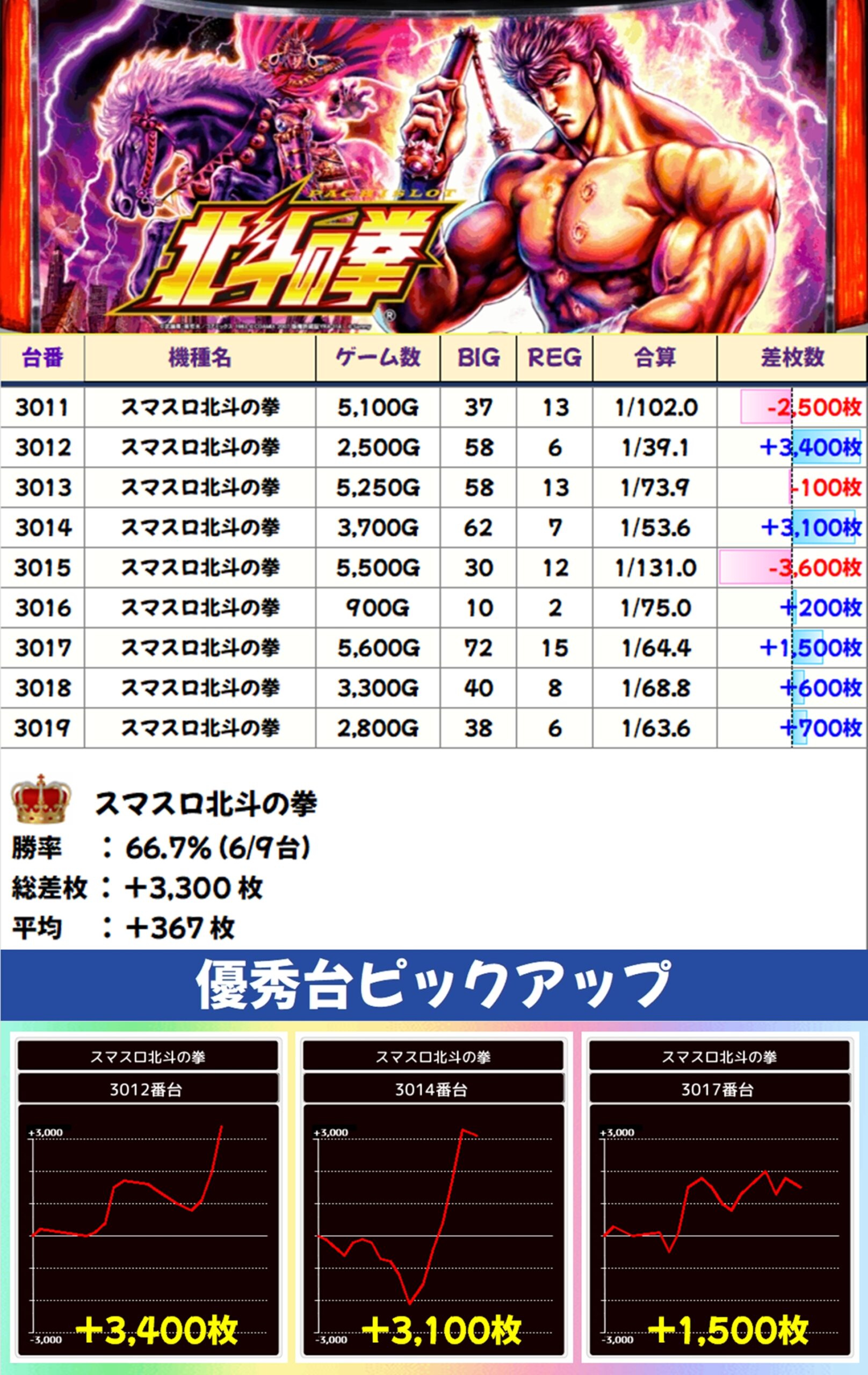 スマスロ北斗の拳(6/9台+)→平均+367枚