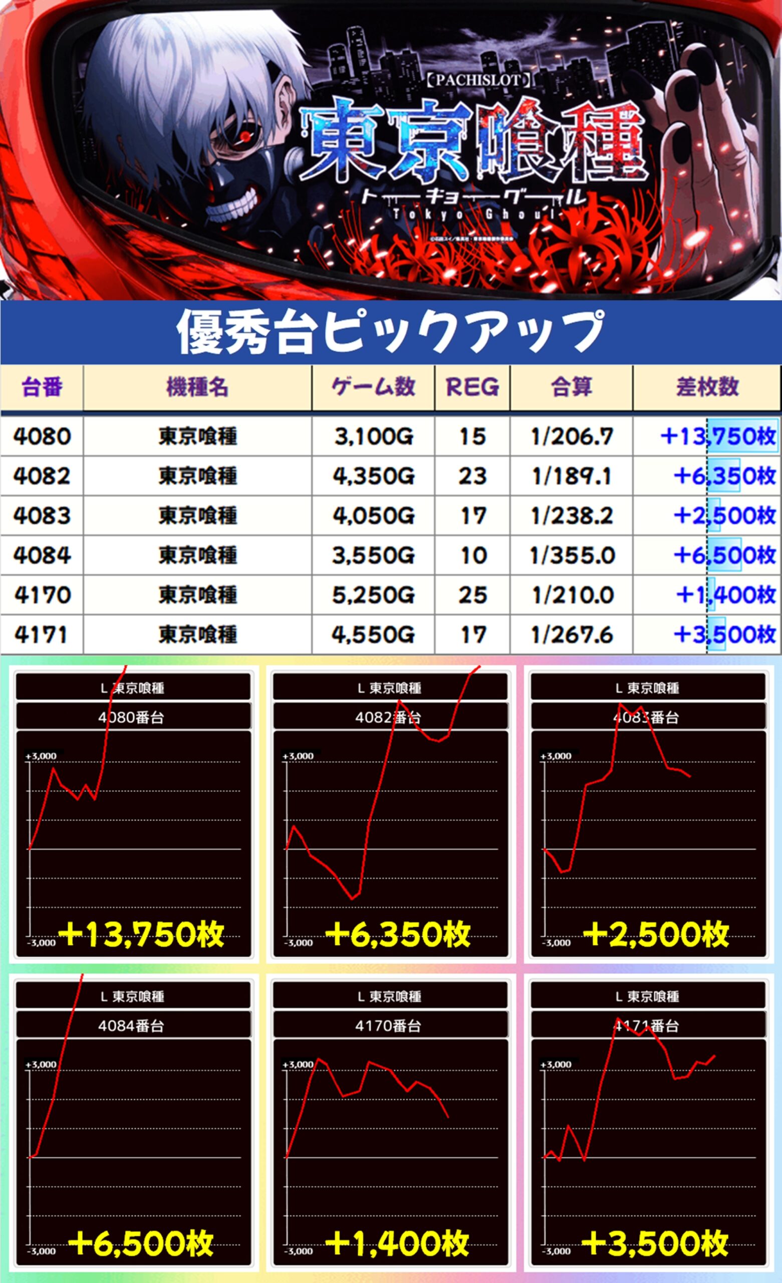 神3だけでなく、人気機種からも当然お宝台を多数確認。東京喰種からは+13750枚の大爆発もありましたね。
