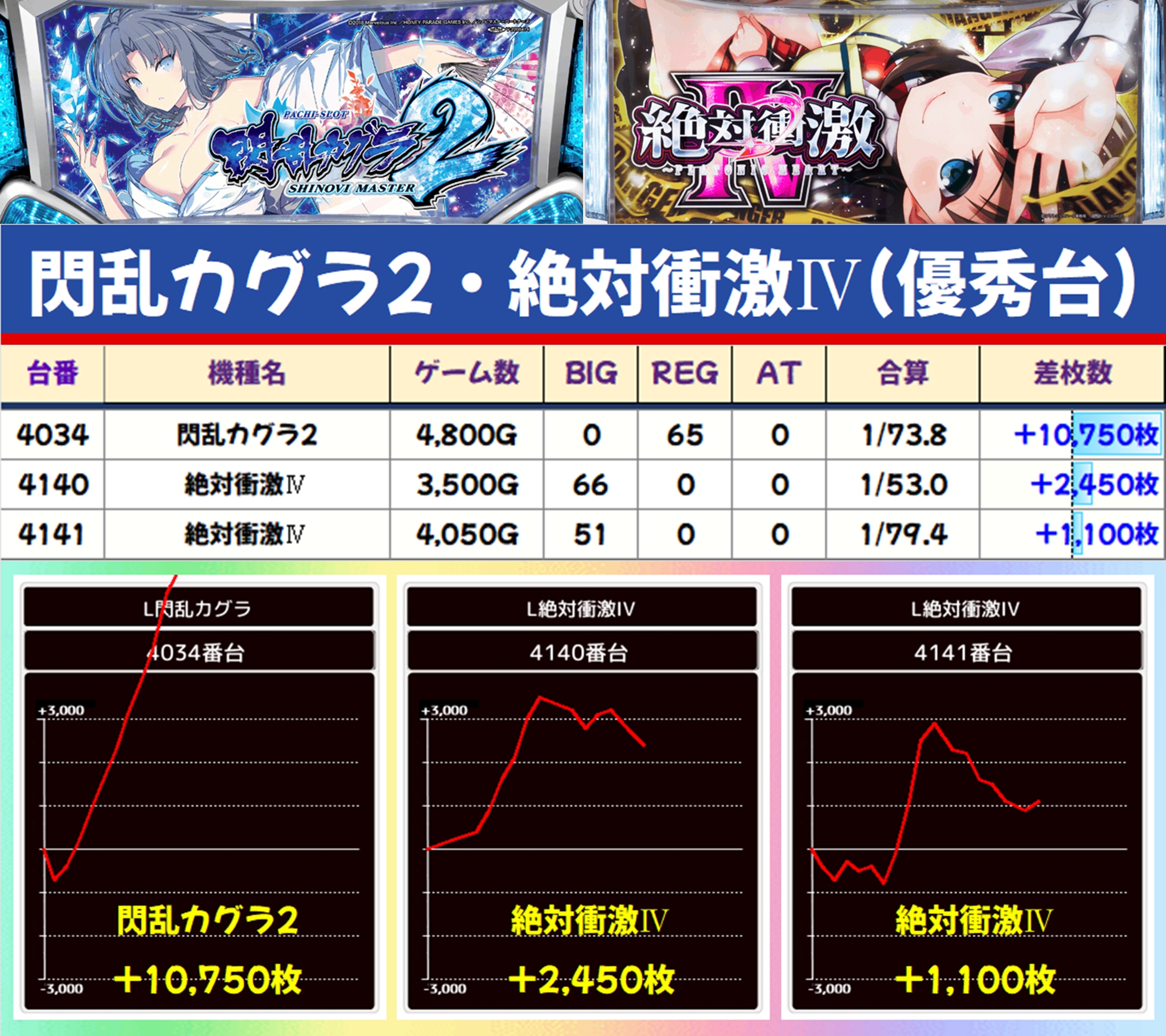 閃乱カグラ2はバラエティの機種になりますが、なんと+10750枚の万枚オーバーを叩き出しました!絶対衝激Ⅳからも優秀な出玉を確認することができましたね。
