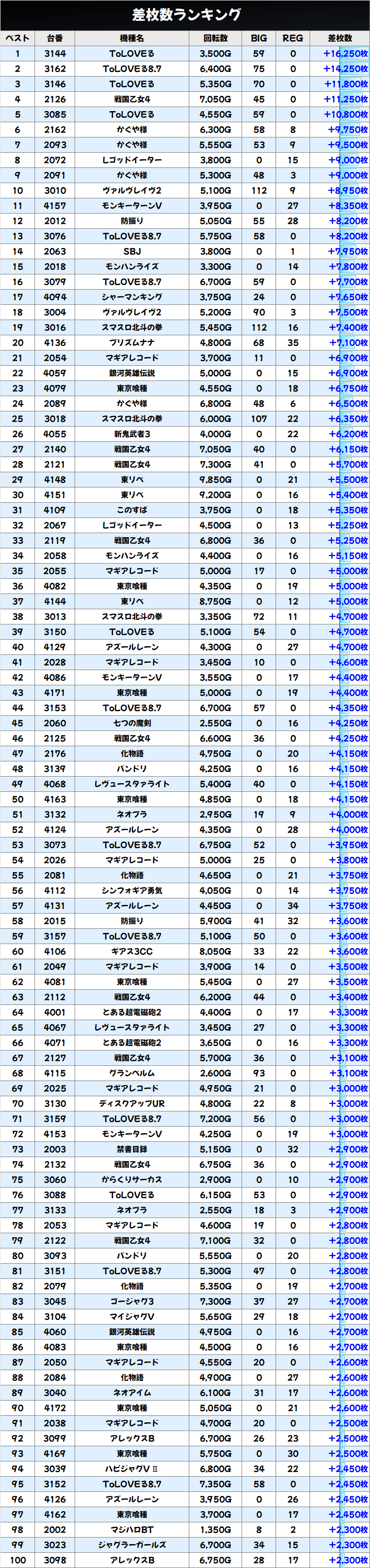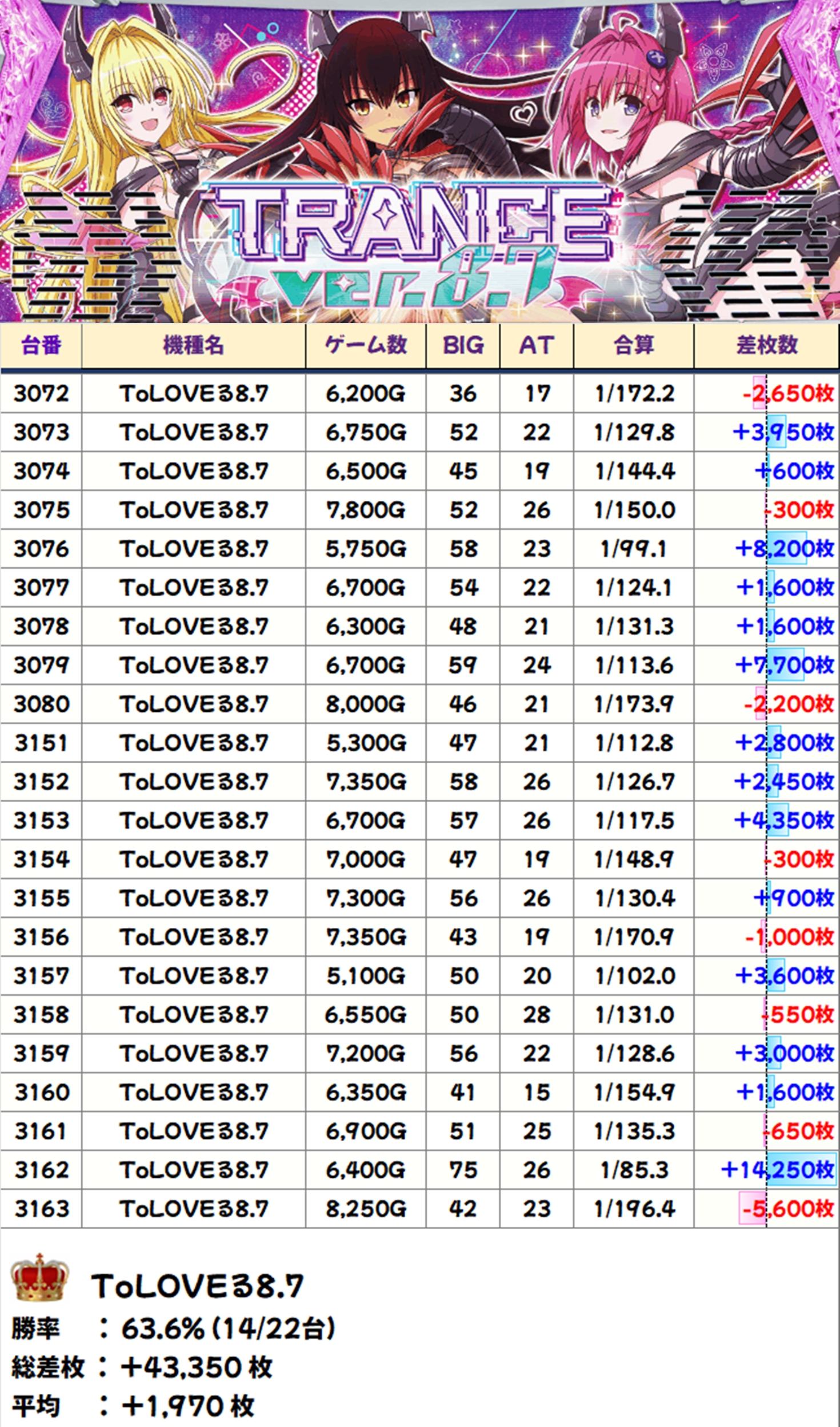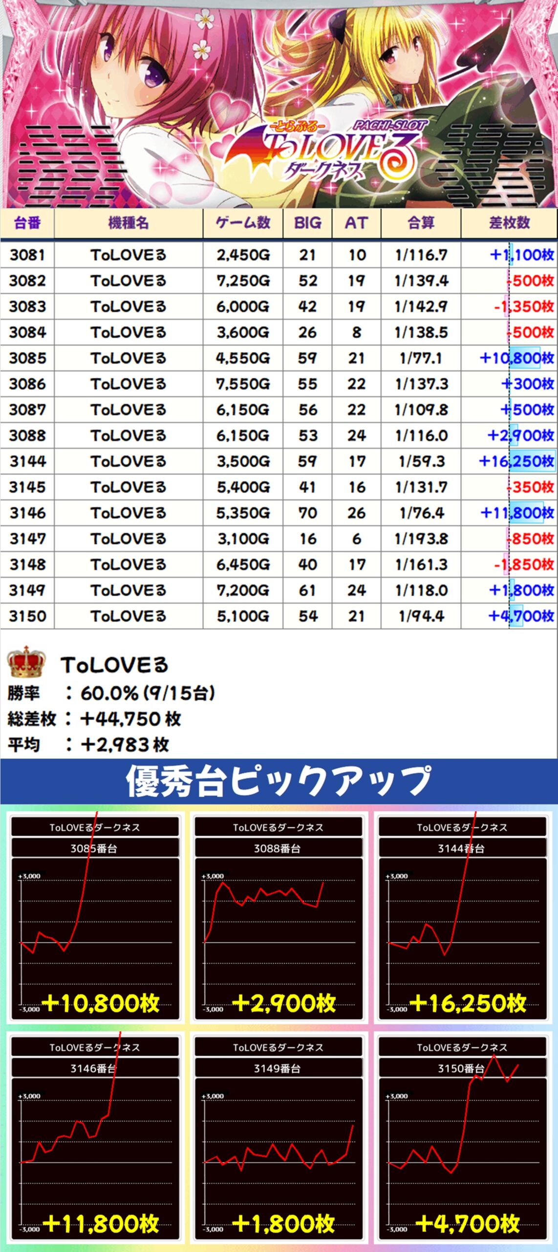 この日はToLOVEるの+16250枚を筆頭の万枚オーバーの大爆発が5台出現!+5000枚以上は37台、+3000枚以上は72台と多数のお宝台が出現しましたね!