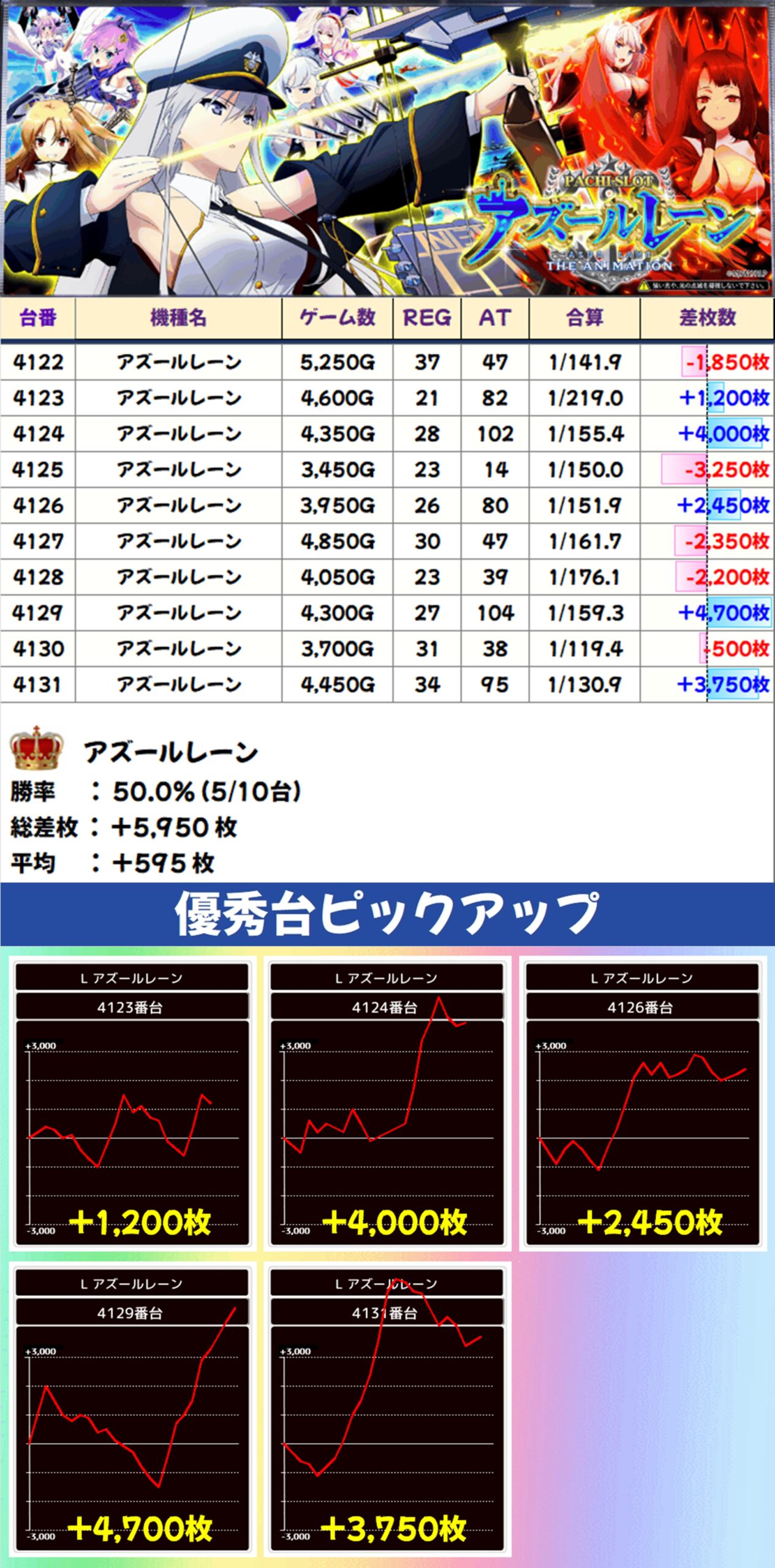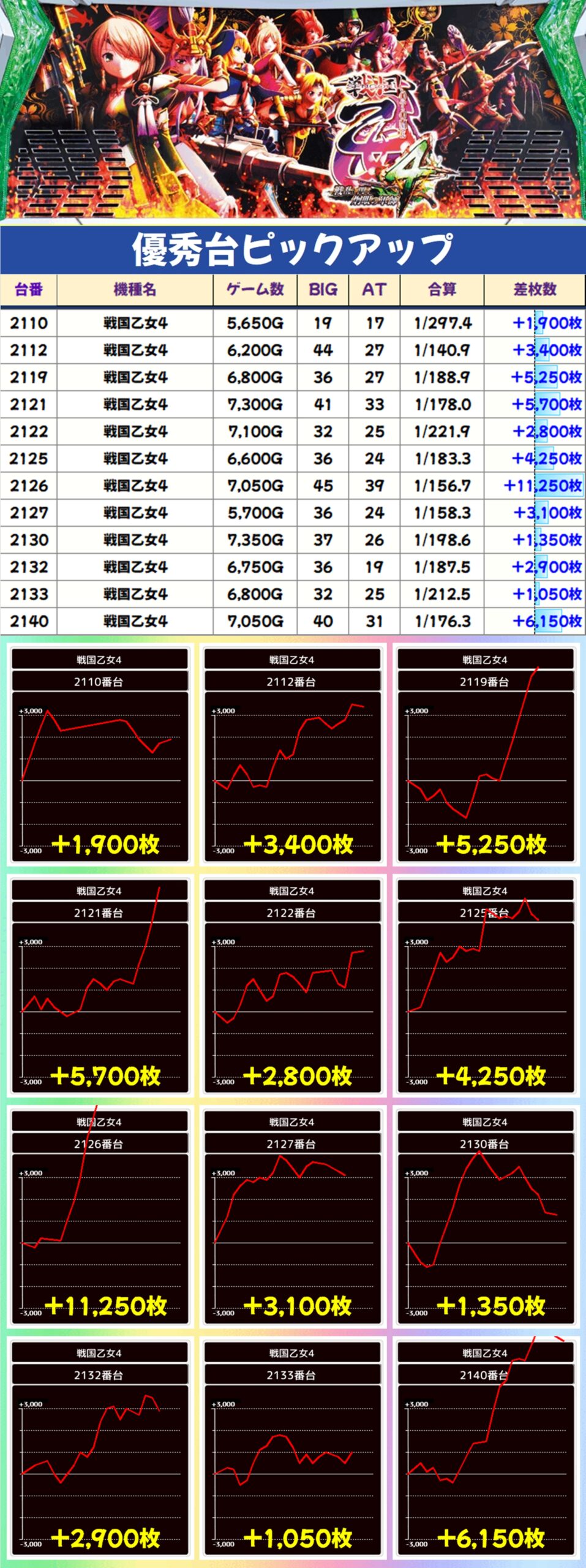 また、声優の上坂すみれさんの誕生日であり、上坂すみれさんはバンドリの白鷺千聖、アズールレーンのクイーン・エリザベス、戦国乙女シリーズの紫苑を担当。こちらの3機種からも大量出玉が多数出現し、戦国乙女4からは+11250枚の万枚オーバーもアリ!