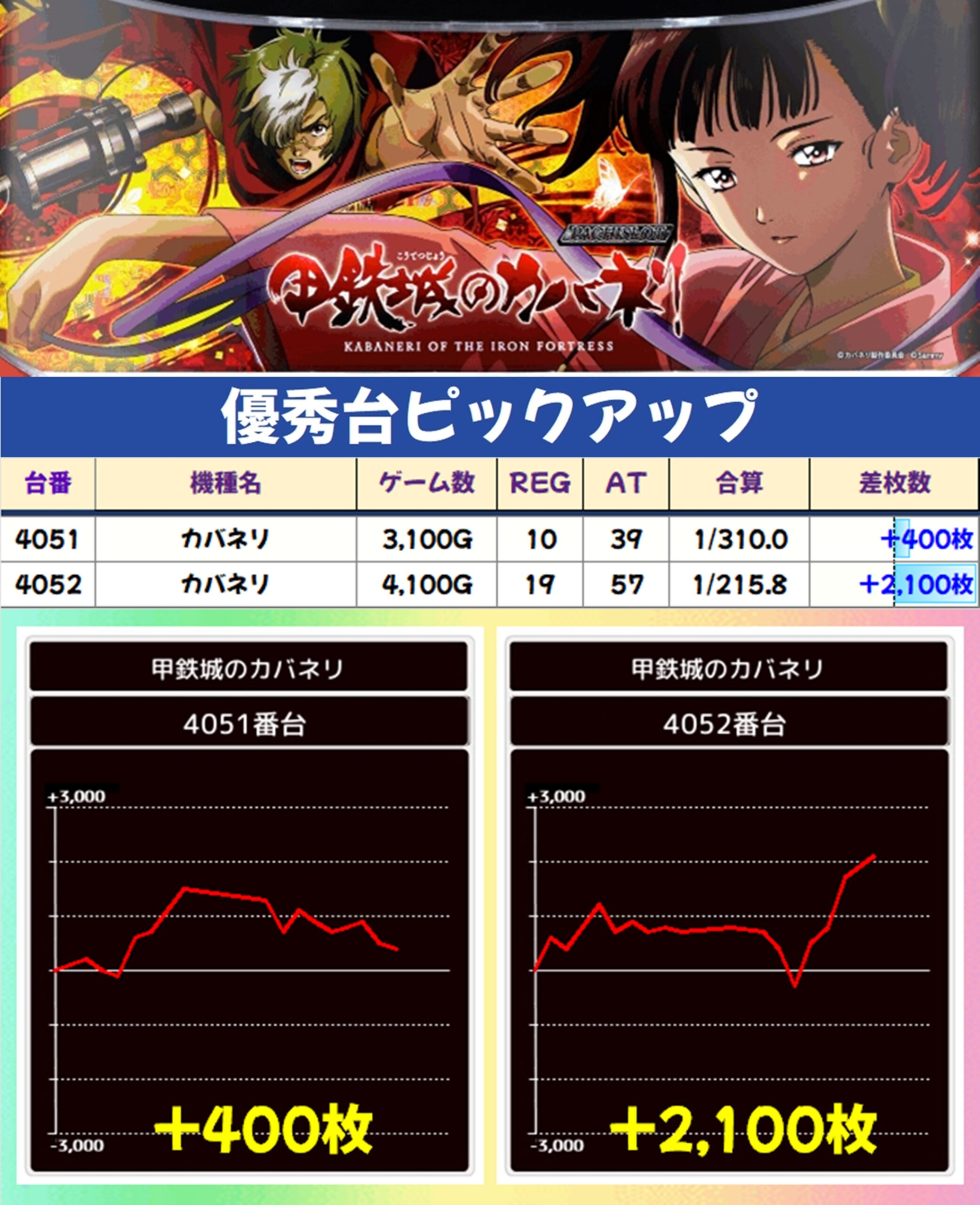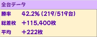 今回は総差枚+115400枚、平均+222枚という結果に。+11万枚オーバーの好成績となり、多数の仕掛け&お宝台を確認できました!