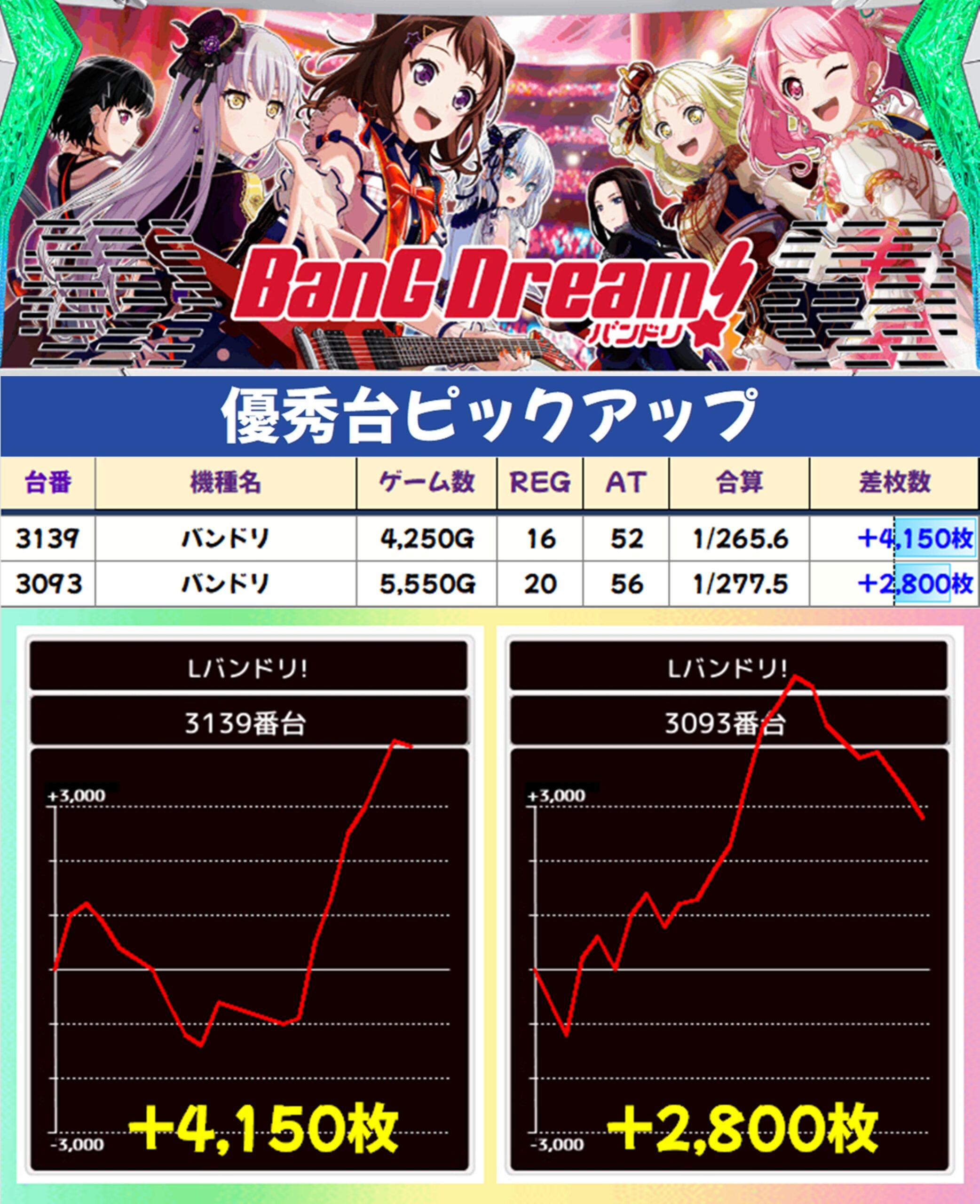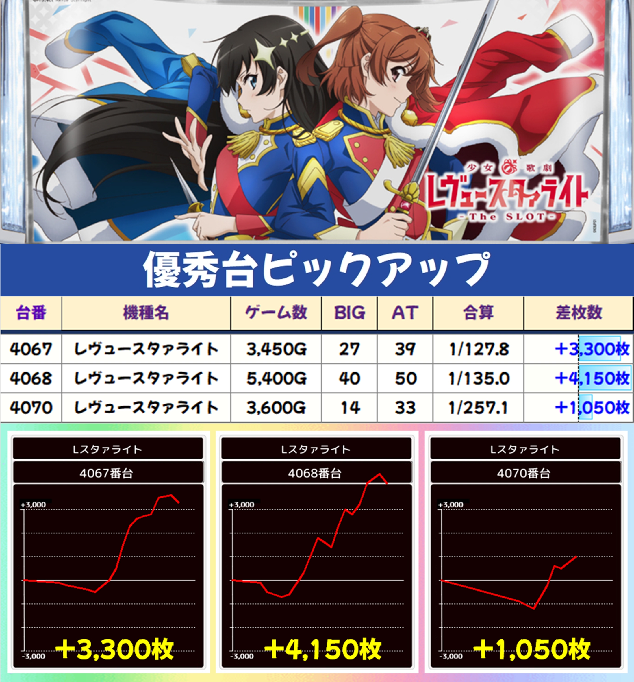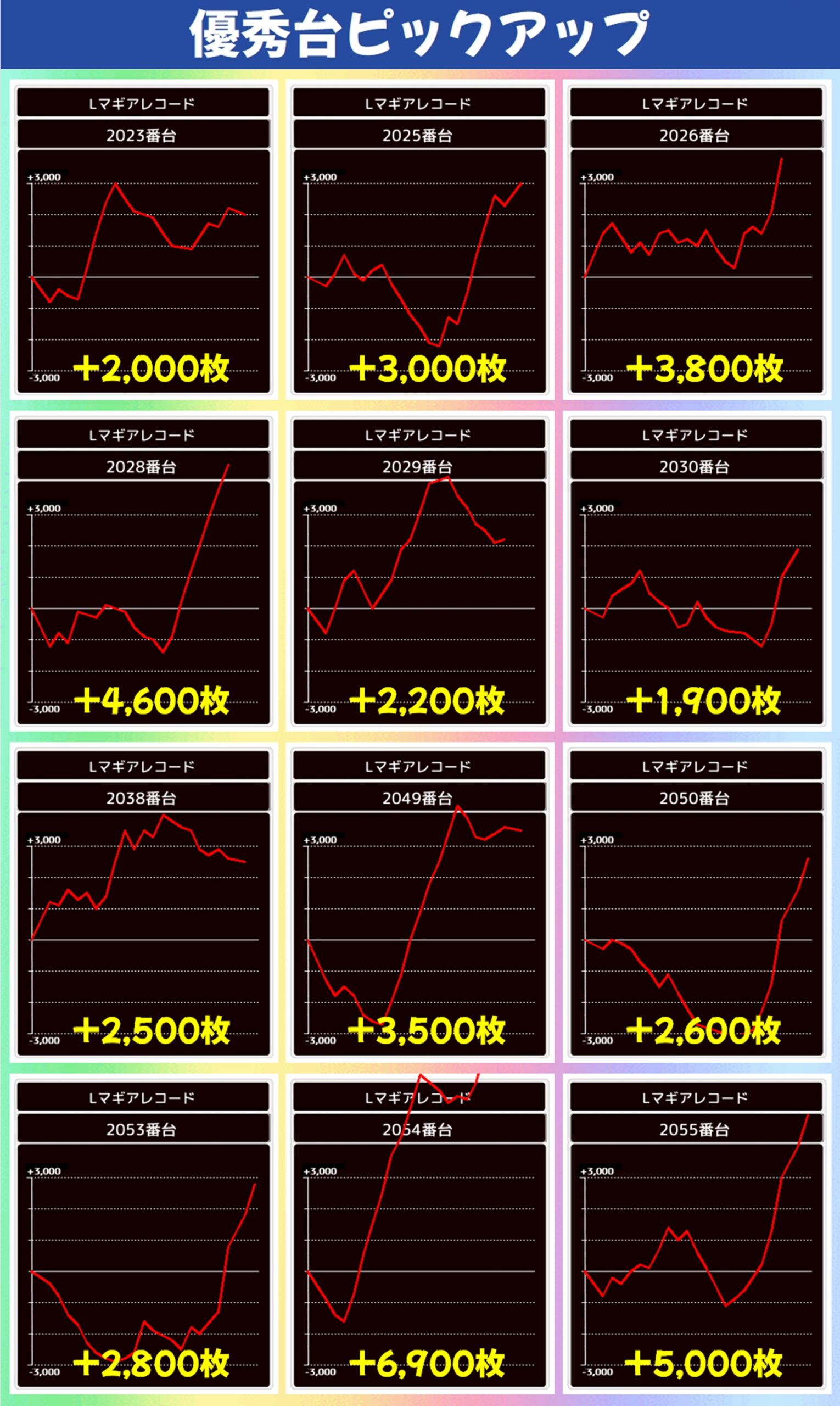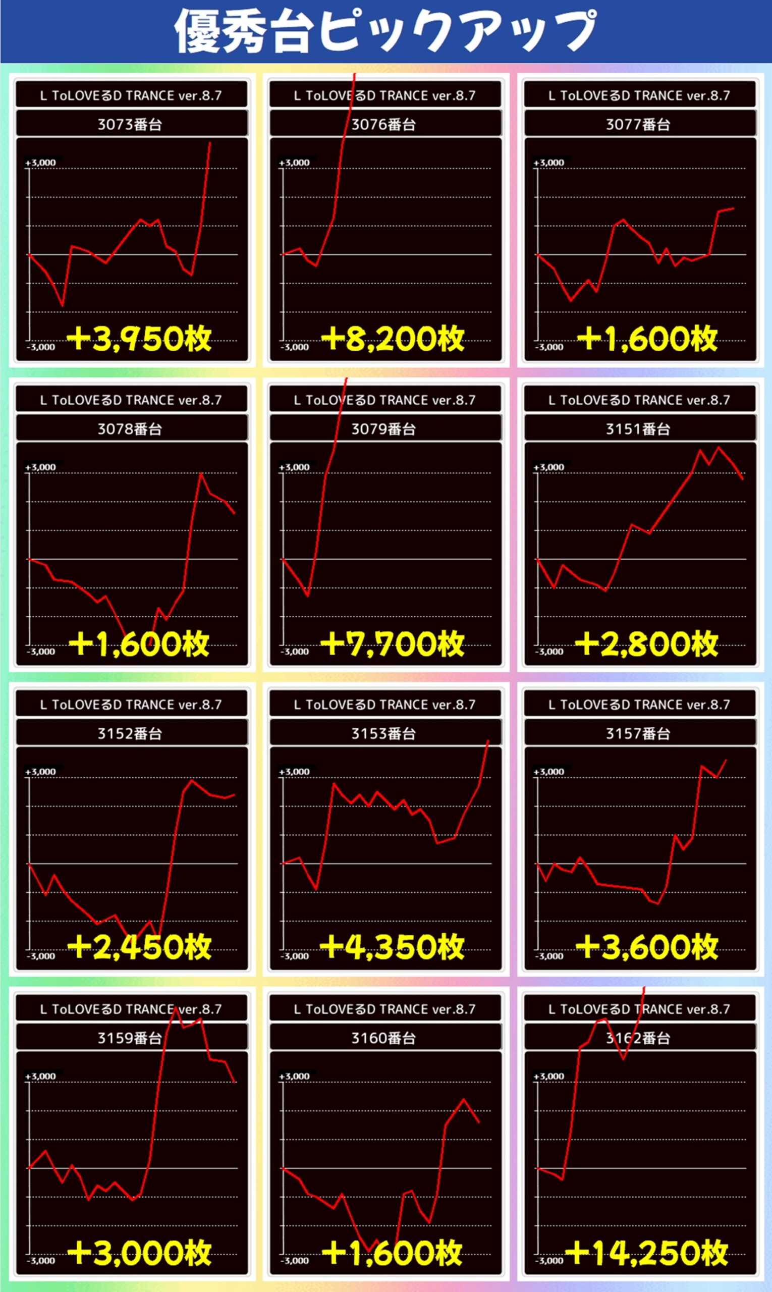 ジャンプオマージュのToLOVEる8.7とToLOVEるはいずれも好成績を残し、ToLOVEる8.7からは+14250枚の万枚オーバーが出現!ToLOVEるからは+16250枚を筆頭に万枚オーバーが3台も飛び出す結果に!