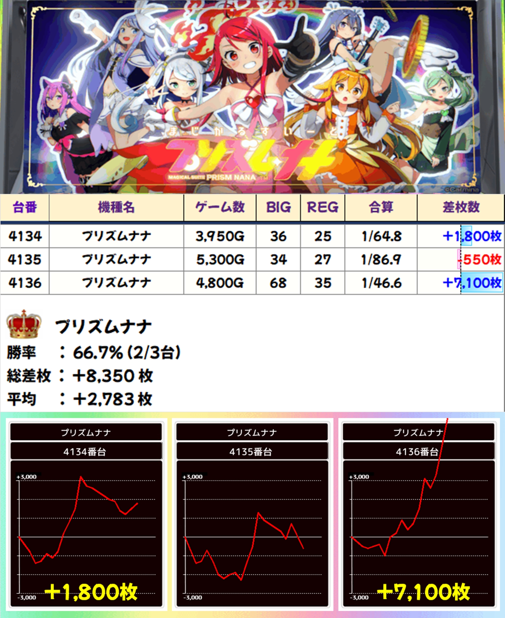 新台系の化物語、銀河英雄伝説、プリズムナナからもお宝台が多数出現。銀河英雄伝説は3台ともプラスとなりました。