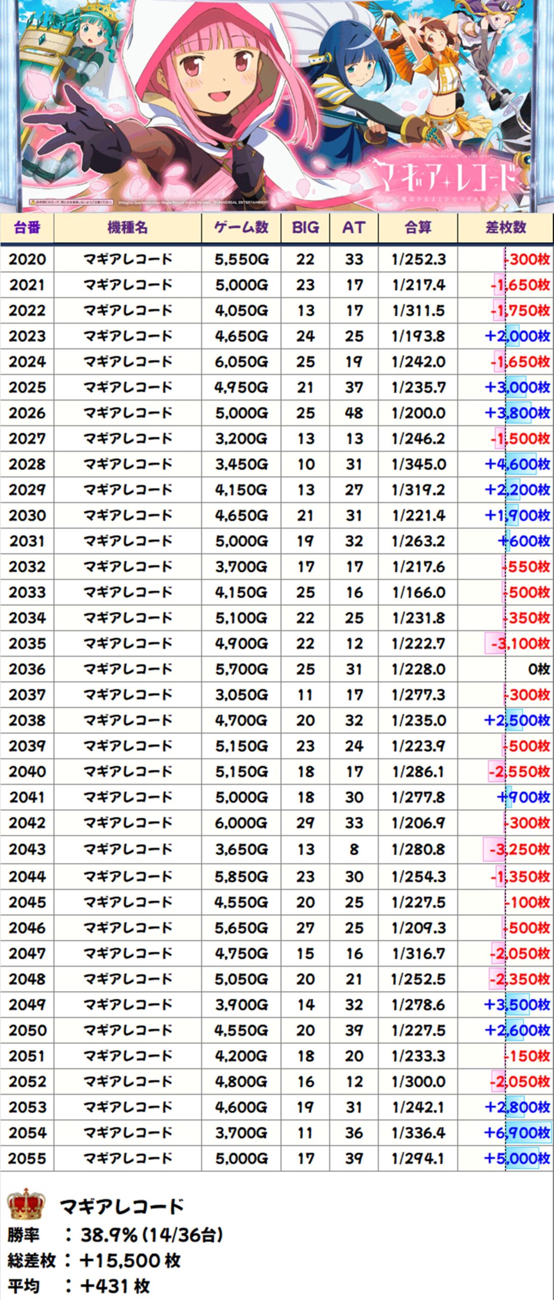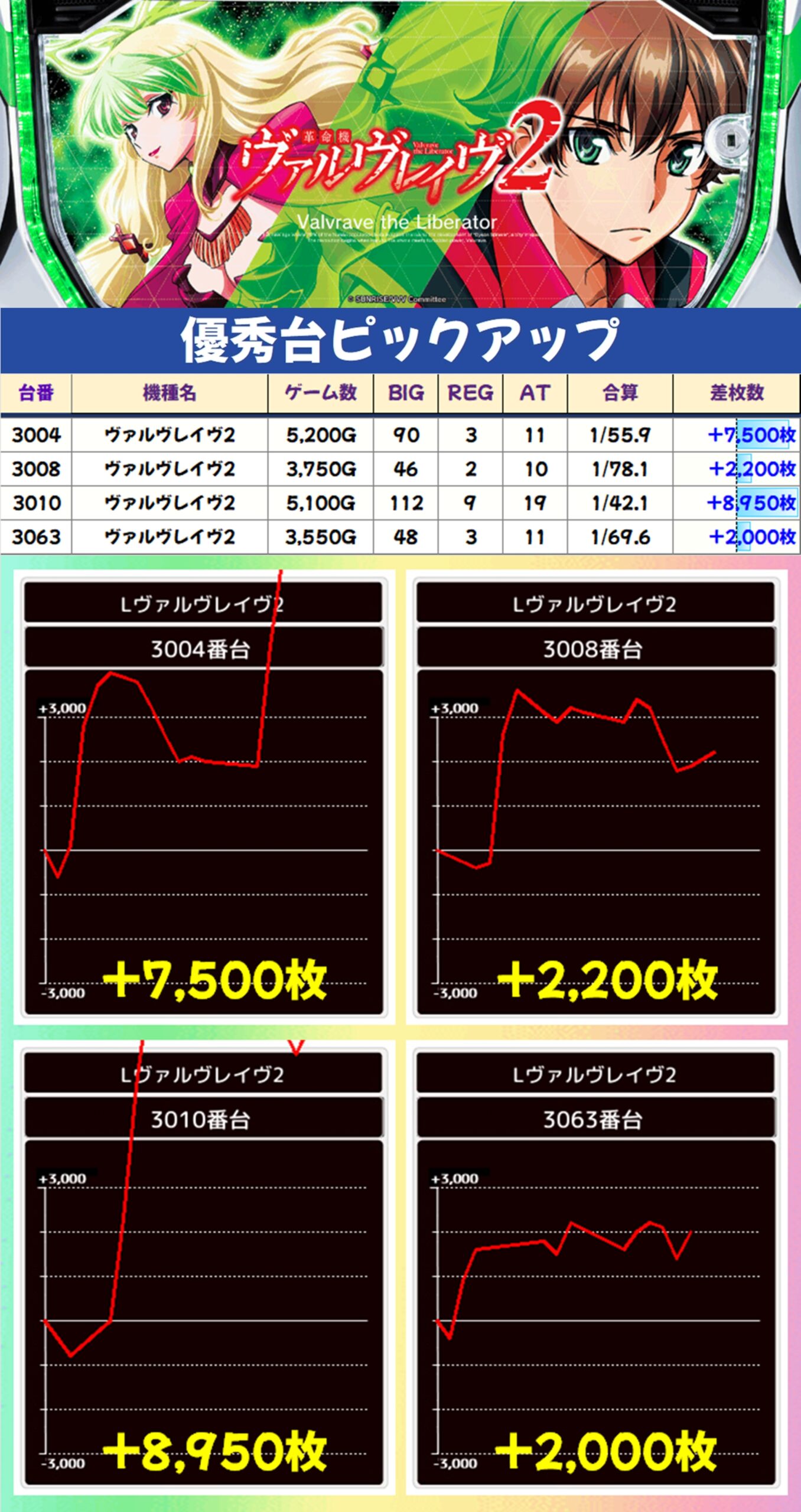 台数が多く人気機種でもあるマギアレコードや東京喰種、ヴァルヴレイヴ2、モンキーターンVからも注目の出玉を確認。