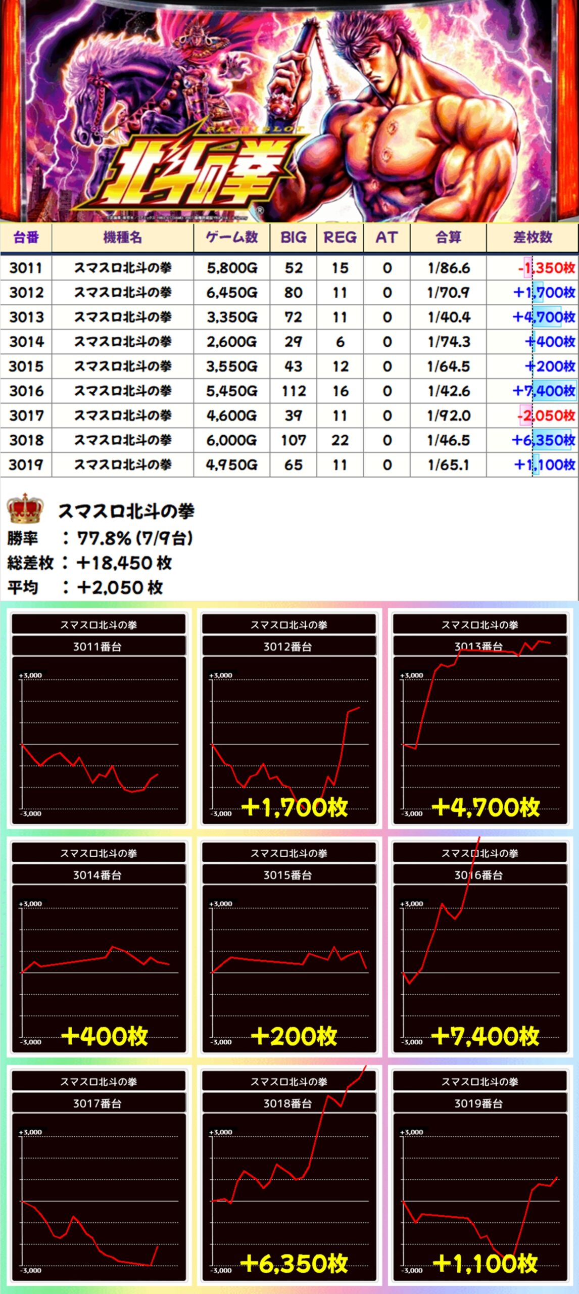 スマスロ北斗の拳もジャンプオマージュ絡みの機種で、こちらは9台中7台がプラスに。大量出玉も確認でき、全台系に近い内容だったのではないでしょうか。