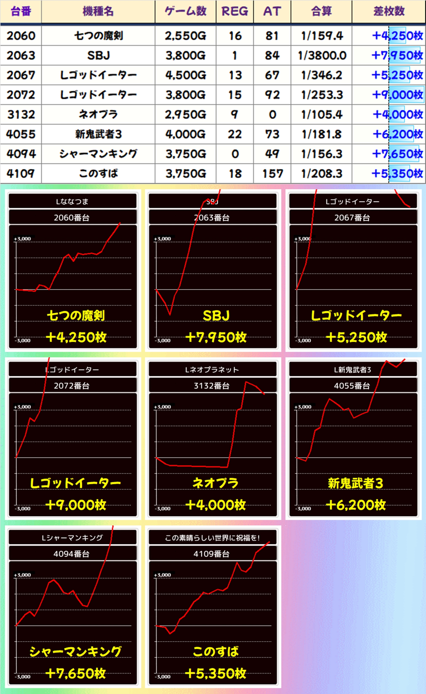 多数の仕掛け以外にもお宝台は多数あり、Lゴッドイーターからは+9000枚や+5250枚の爆発台が出現。その他にも、七つの魔剣やSBJ、ネオプラ、新鬼武者3、シャーマンキング、このすばなど様々な機種からお宝台を確認できました!