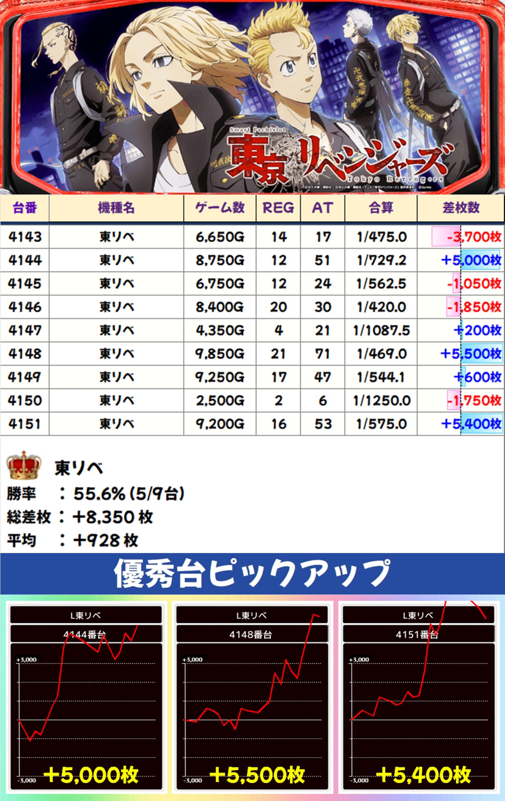 この日は東リベの松野千冬のキャラ誕の日で、東リベからは3台の+5000枚以上の大量出玉が出現!