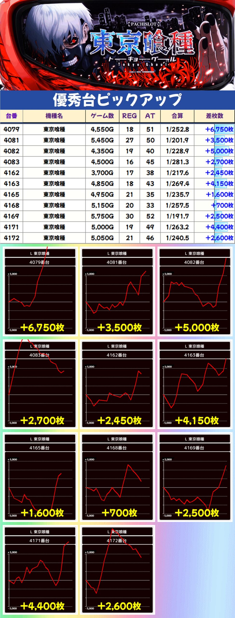東京喰種は半数がプラス差枚となり、モンキーターンVはプラス差枚となった5台はいずれも優秀な出玉を獲得しました!