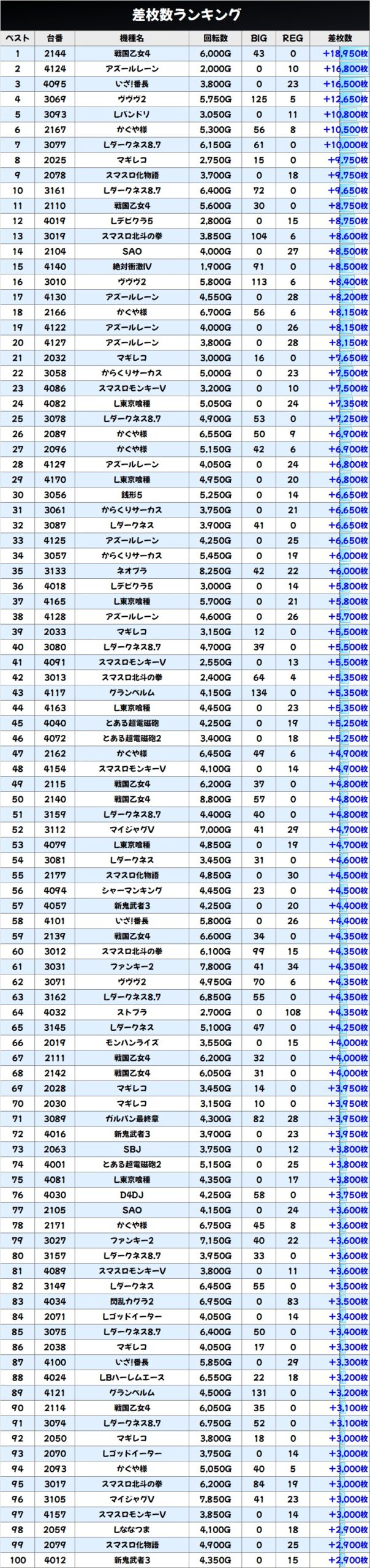 高配分機種は8機種以上!主に人気スマスロが扱いが良く、全機種台平均はプラス差枚!荒波スペックが多いですが、各機種1台は5000枚クラスを叩き出しました!