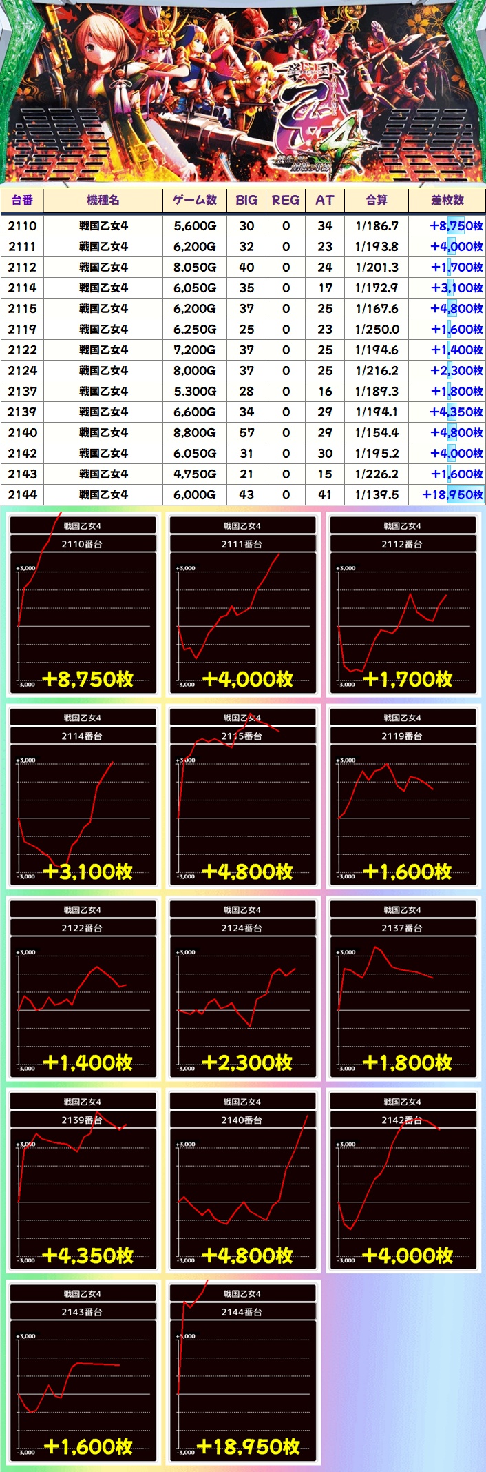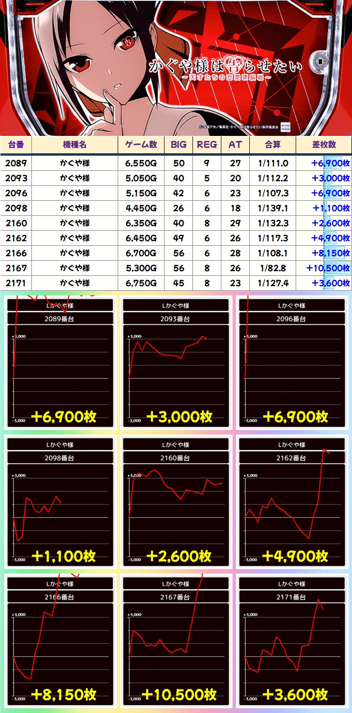 神3の戦国乙女4、かぐや様からもお宝台を多数確認。乙女4とかぐや様は万枚超もあり!この3機種は毎日力が入っているので移台に困ったら狙い目!