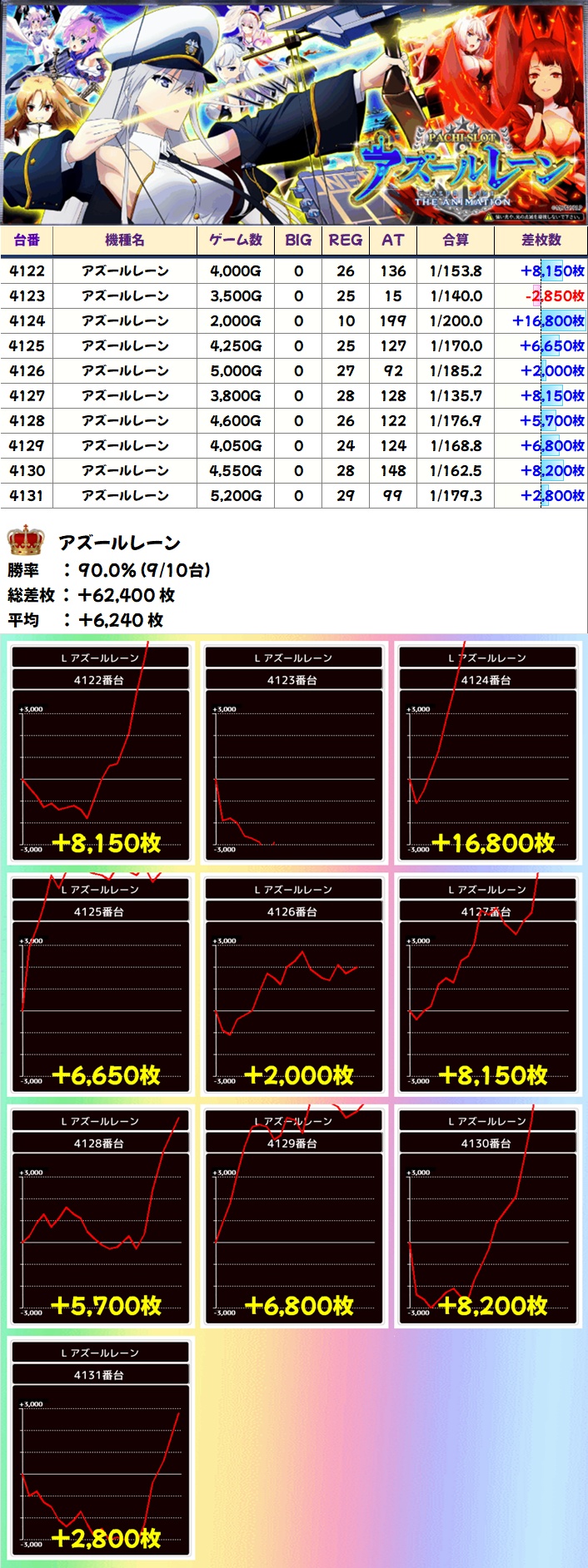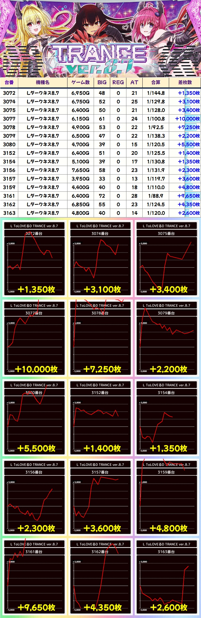 全台系濃厚機種は3機種あり!いずれも大量獲得台が複数あり、アズレンからはコンプクラス、ToLOVEる8.7からは万枚クラスが複数出現しました!