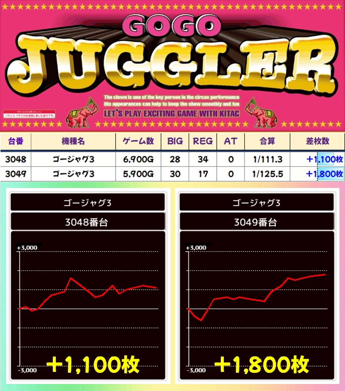 ジャグも明らかに普段以上に扱いが良く、ファンキー2やウルトラミラジャグは平均1000枚超!そのほかジャグの優秀台がちりばめられていたので、特日では悪い番号でもあきらめる必要はないですよ!