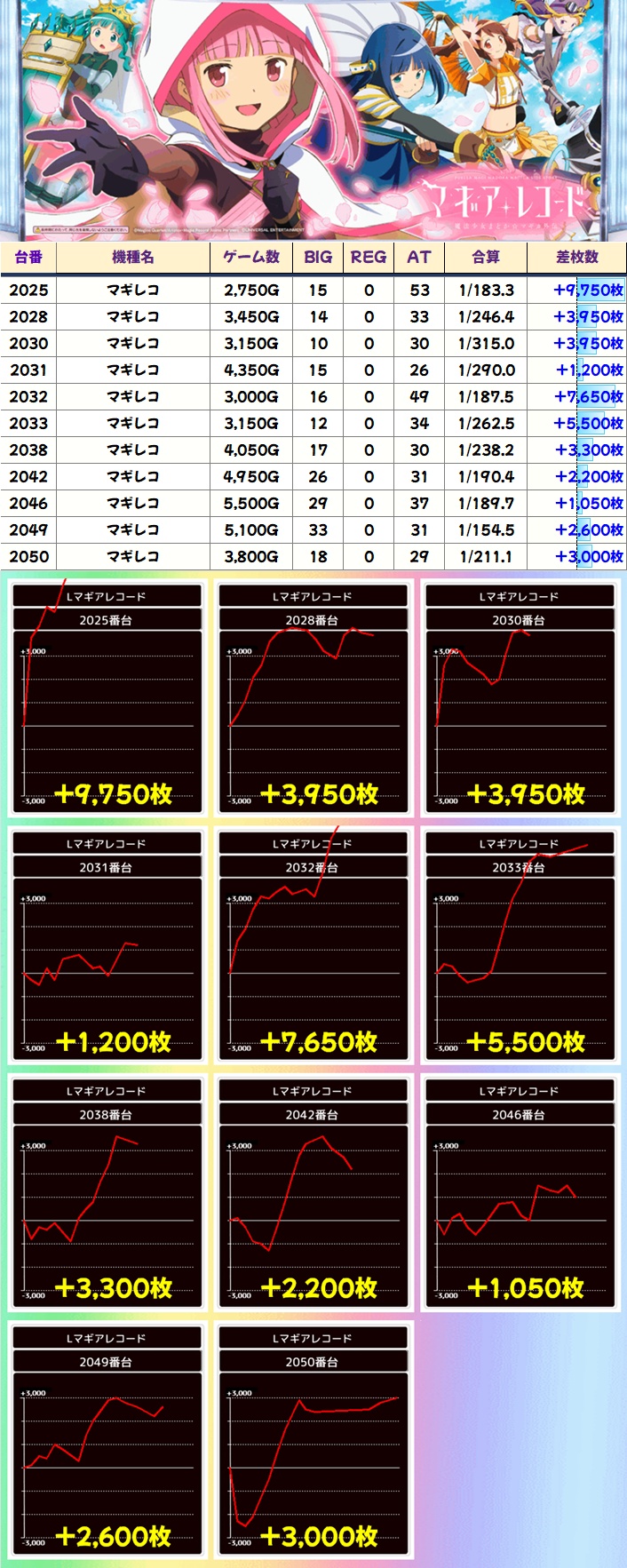 台数が多く人気機種でもあるマギアレコードやToLOVEるからも注目の出玉を確認。とびぬけて大量獲得した台もありますが、どちらかというと高ベース仕様だったかなと
